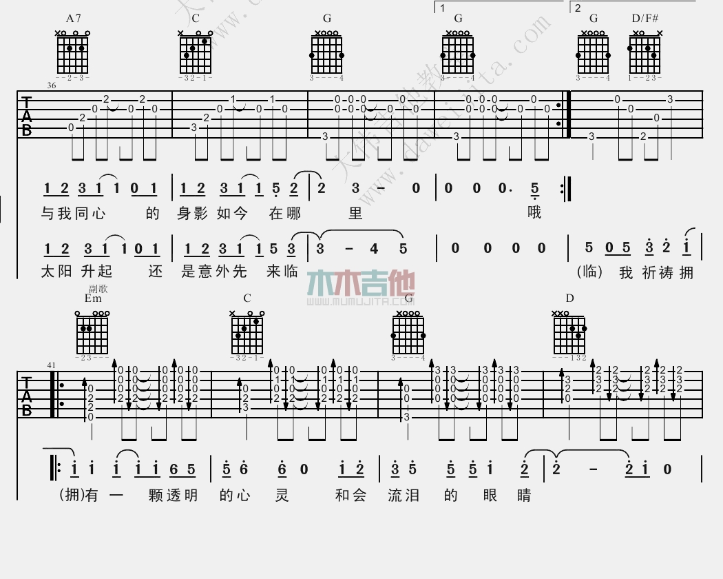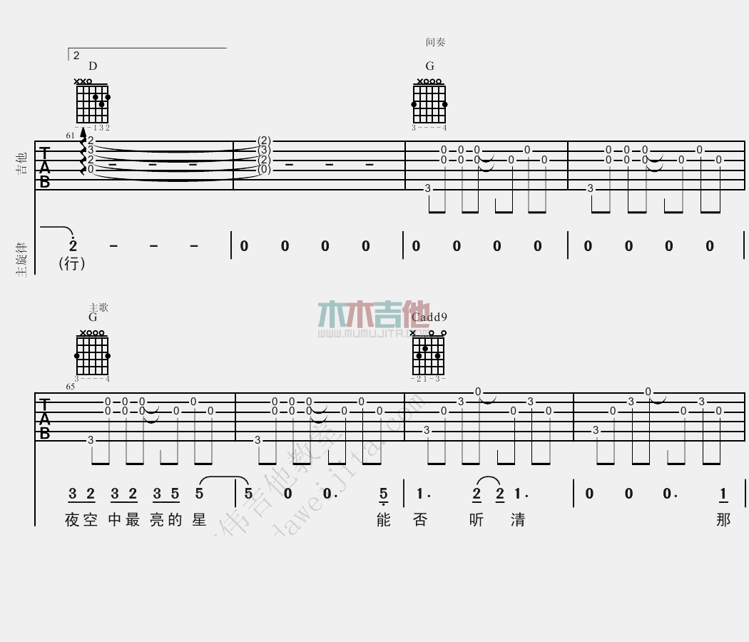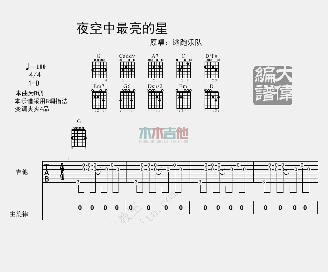 曲谱介绍: 逃跑计划《夜空中最亮的星》吉他弹唱谱,采用B调指法编配,共有10张高清图谱。