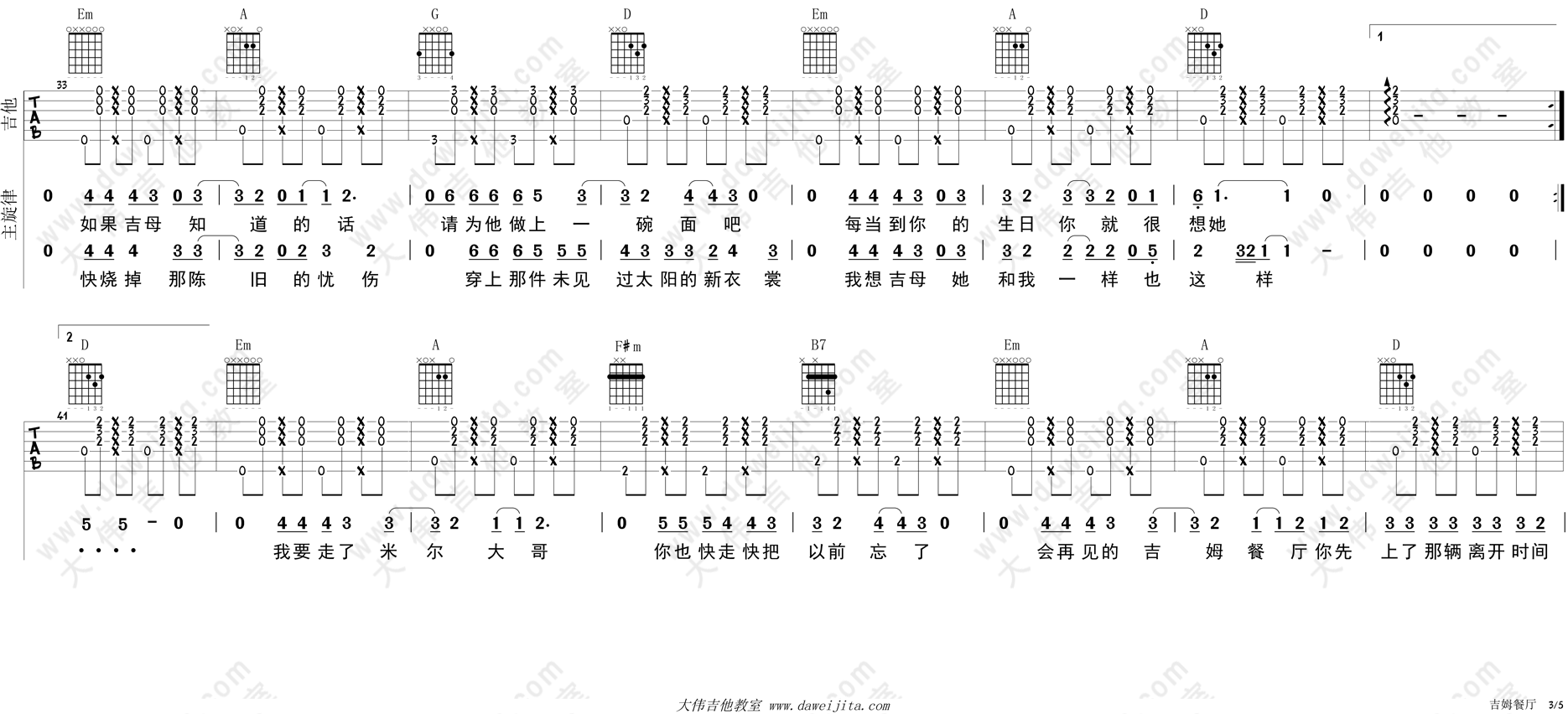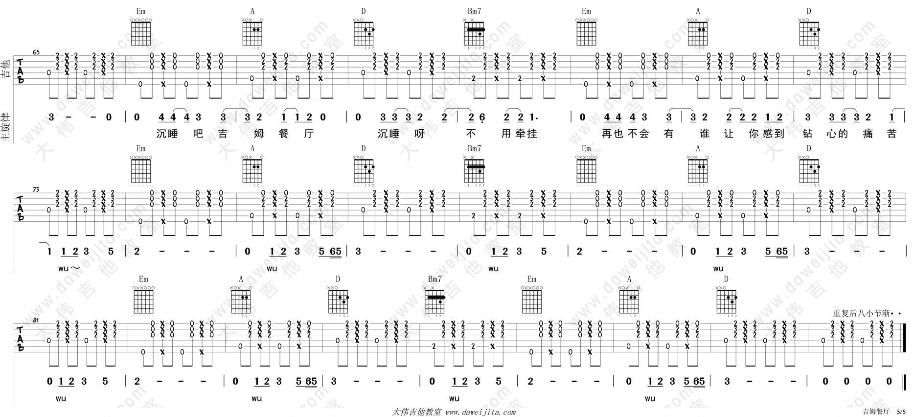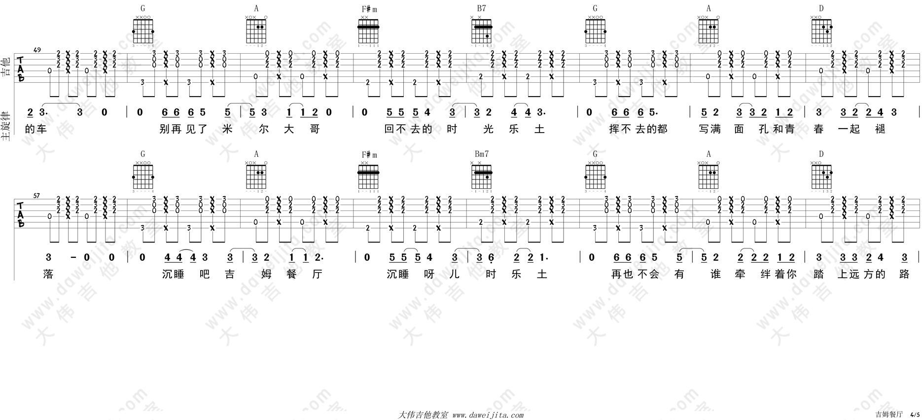 曲谱介绍: 赵雷《吉姆餐厅》吉他弹唱谱,采用D调指法编配,共有5张高清图谱。
