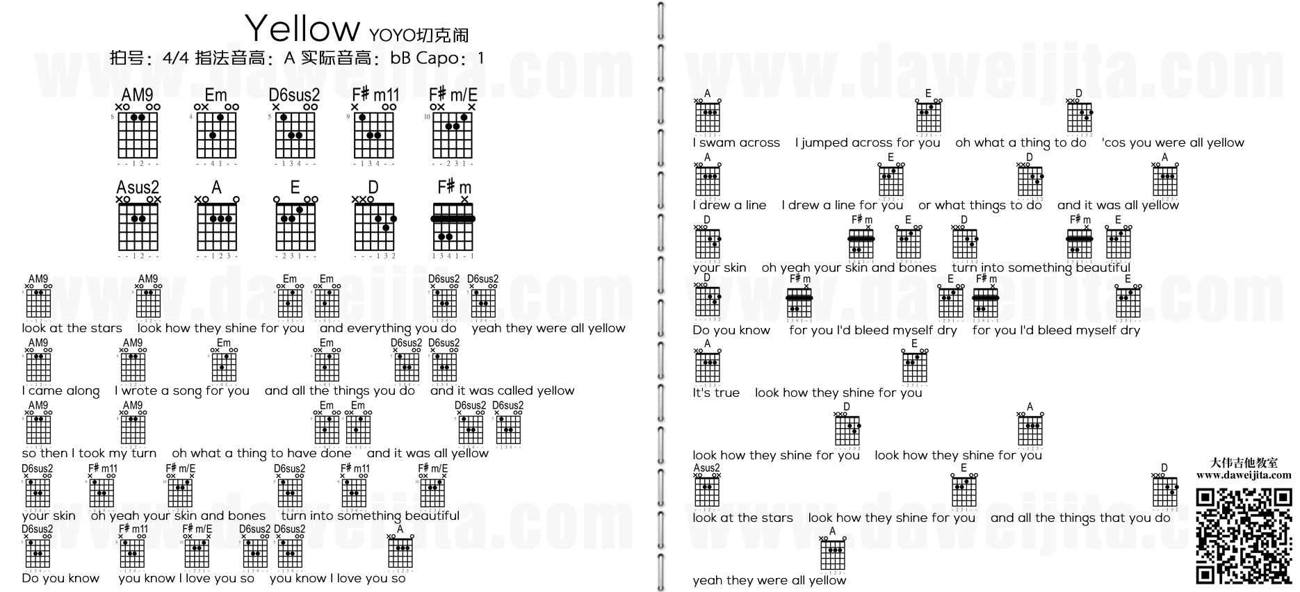 曲谱介绍: Coldplay《Yellow》吉他弹唱谱,采用A调指法编配,共有1张高清图谱,免翻页排版设计。