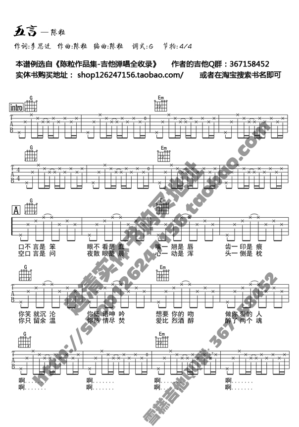 曲谱介绍: 陈粒《五言》吉他弹唱谱,共有2张高清图谱,免翻页排版设计。