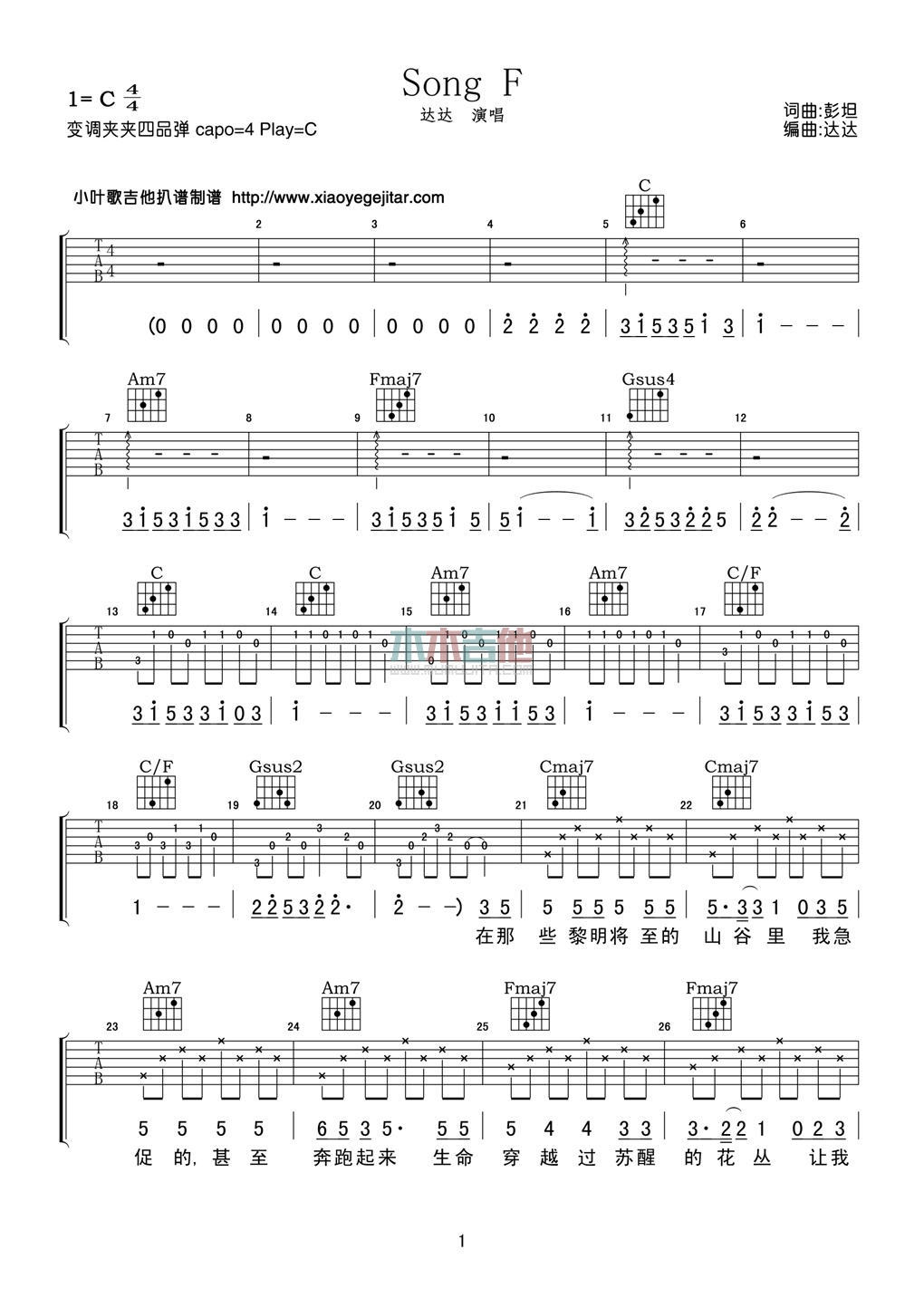 Song F吉他谱 - 达达乐队 - 吉他弹唱谱