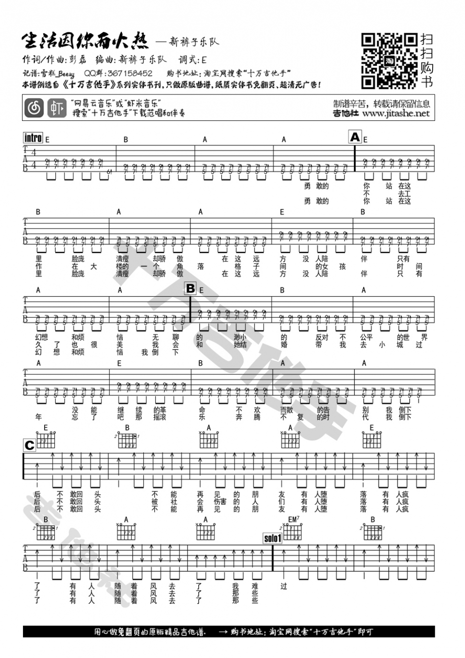 生活因你而火热吉他谱 - 新裤子乐队 - 吉他弹唱谱