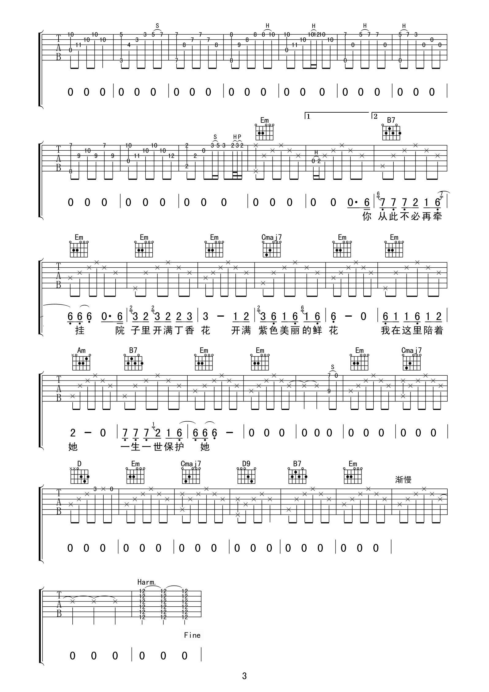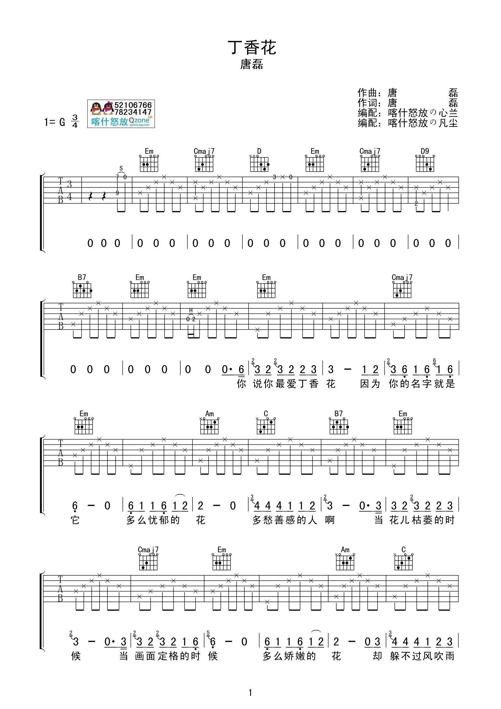 曲谱介绍: 唐磊《丁香花完美间奏》吉他弹唱谱,共有3张高清图谱。