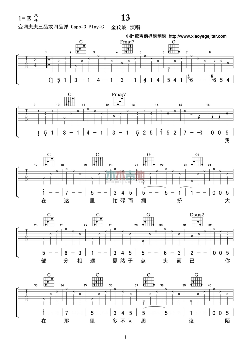 13吉他谱 - 金玟岐 - 吉他弹唱谱
