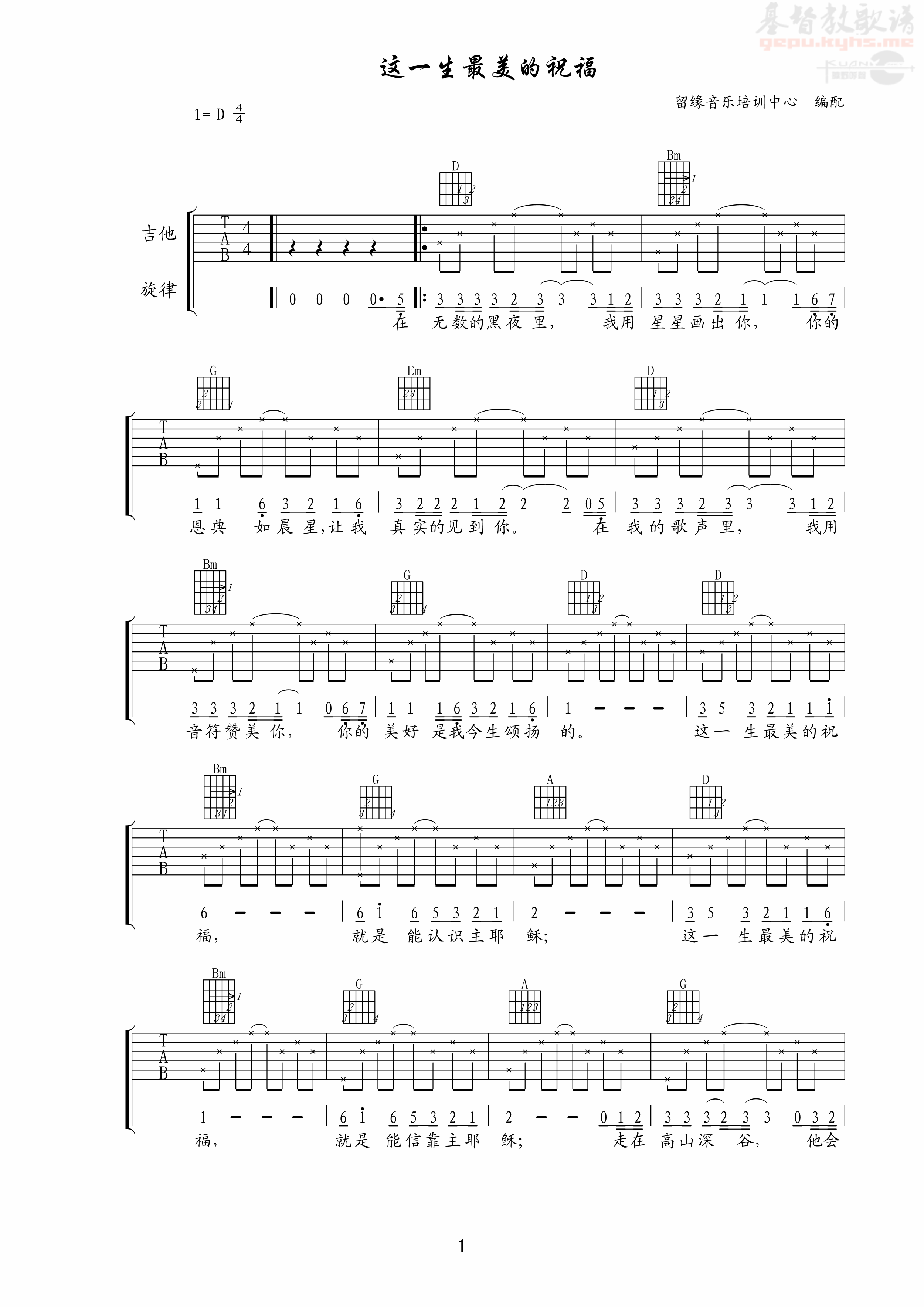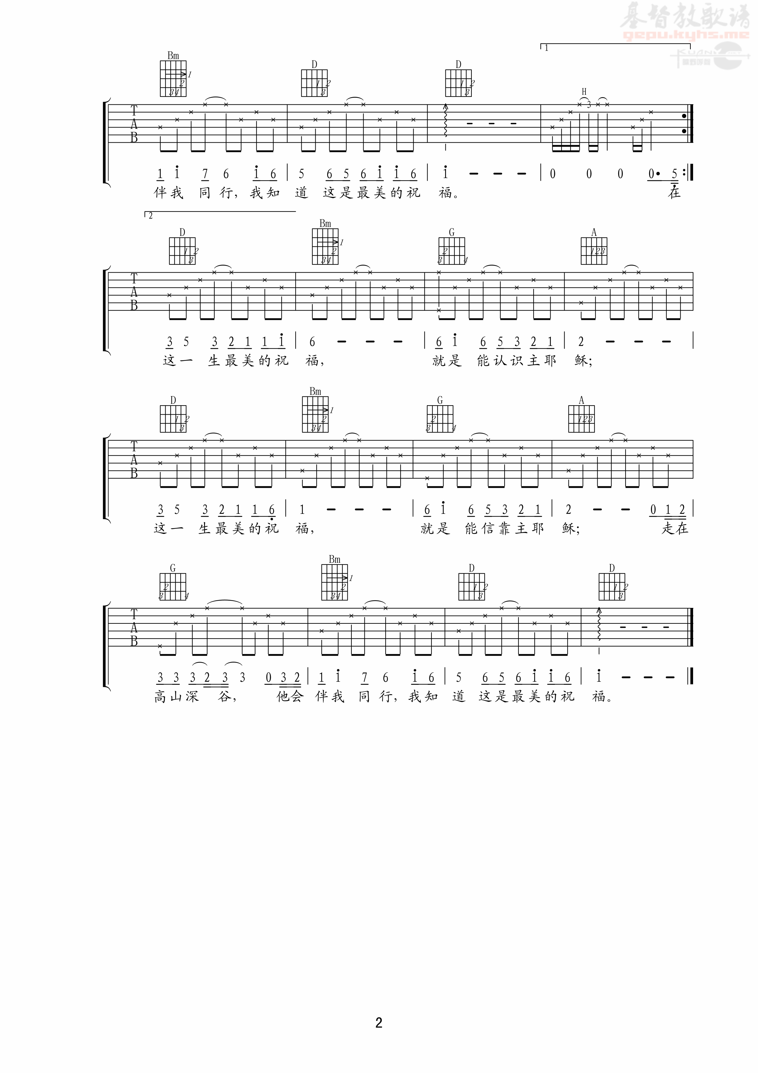 曲谱介绍: 赞美诗《这一生最美的祝福》吉他弹唱谱,共有2张高清图谱,免翻页排版设计。