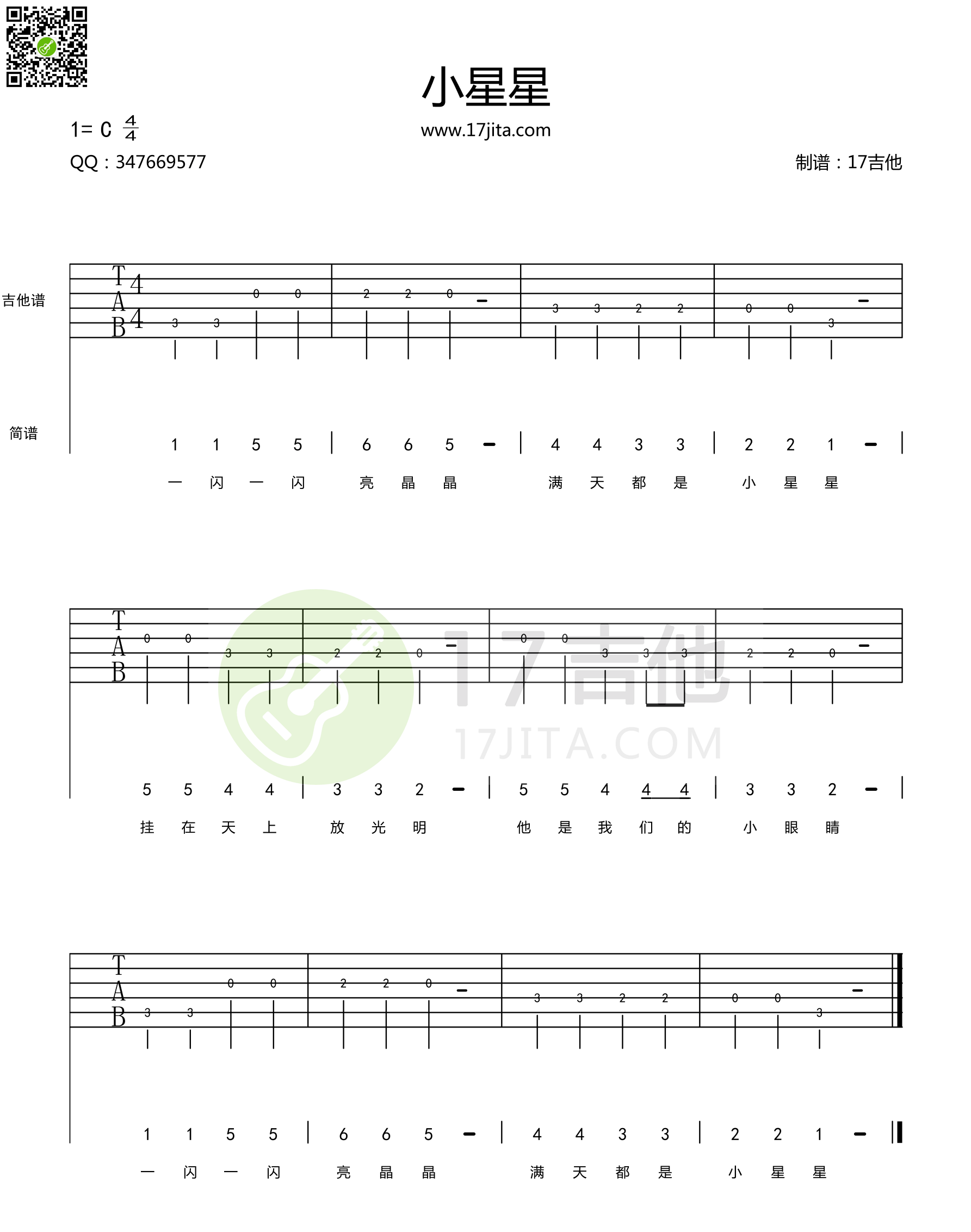 小星星 简单版吉他谱 - 儿童歌曲 - 吉他弹唱谱