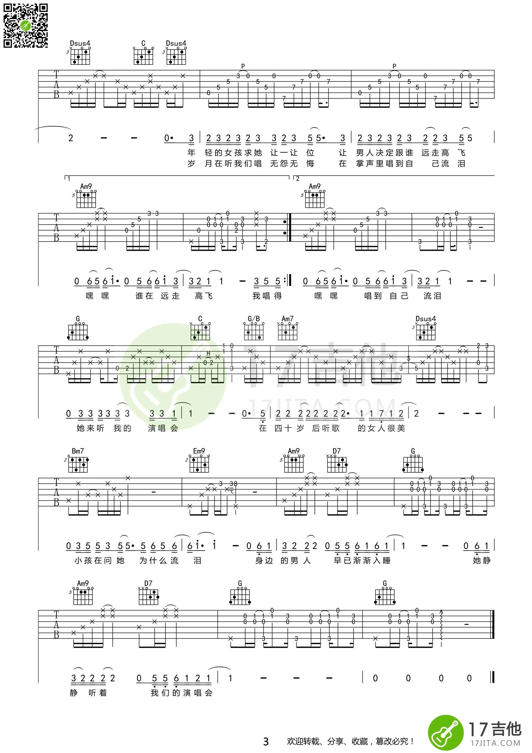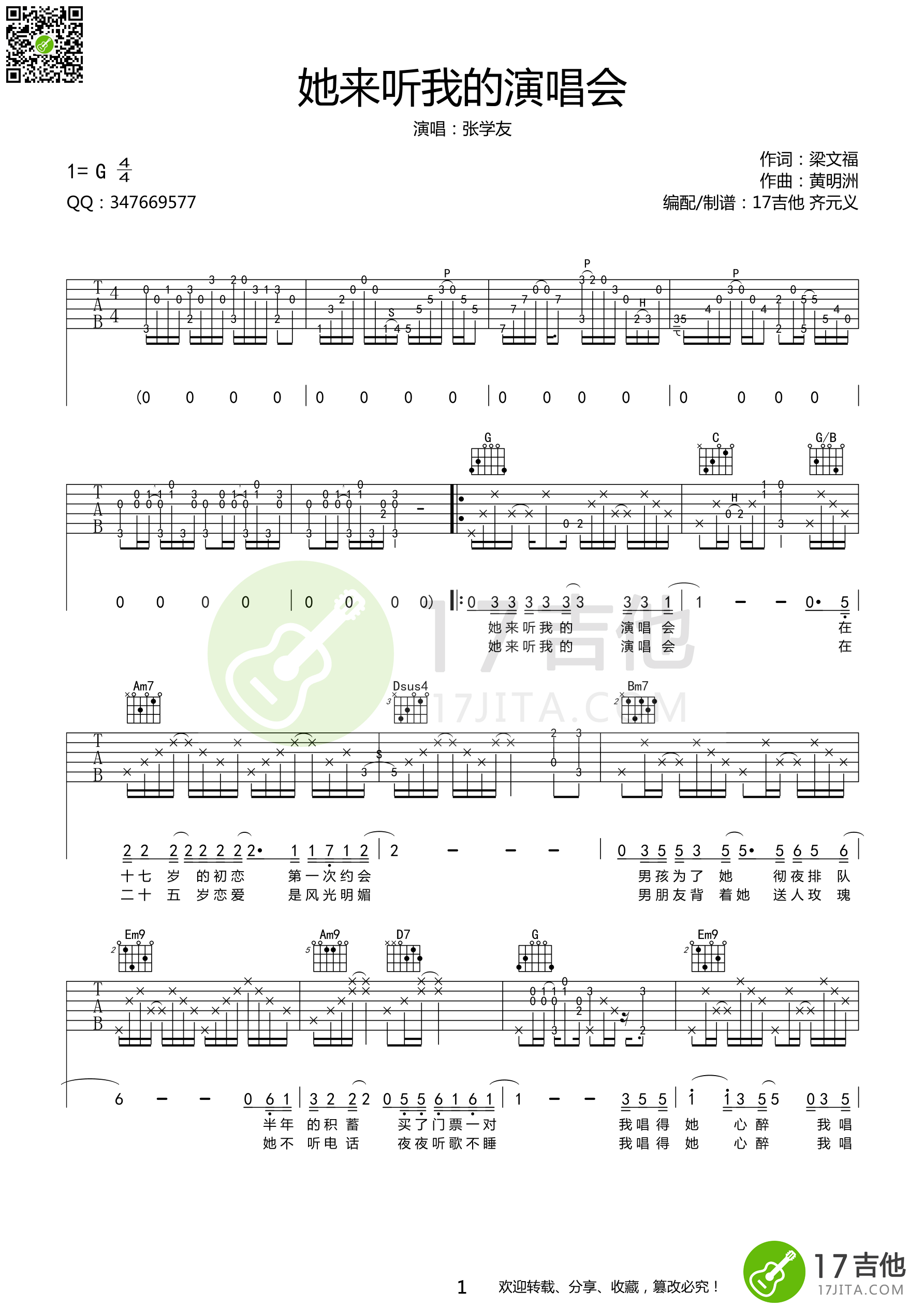 曲谱介绍: 张学友《她来听我的演唱会》吉他弹唱谱,共有3张高清图谱。
