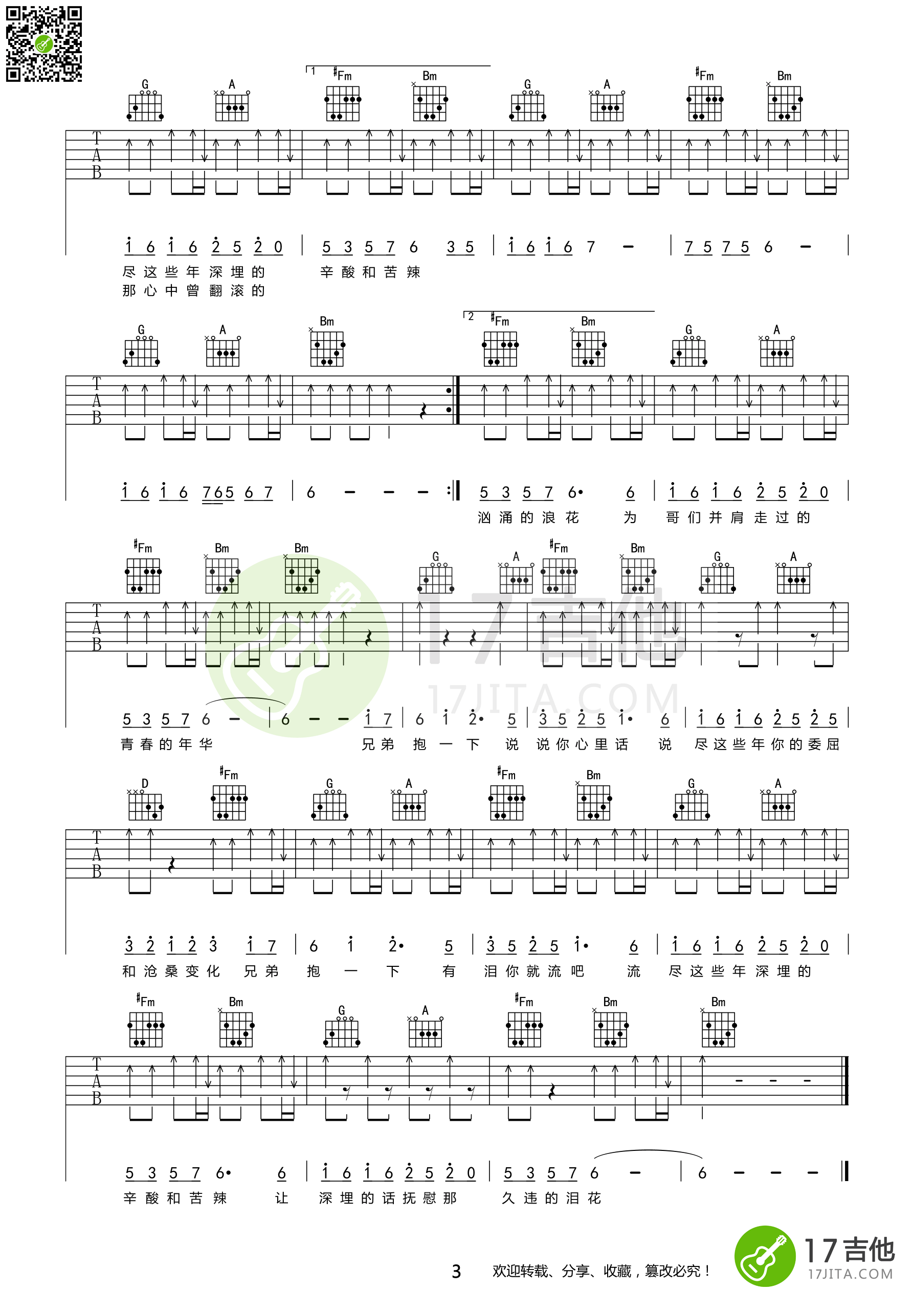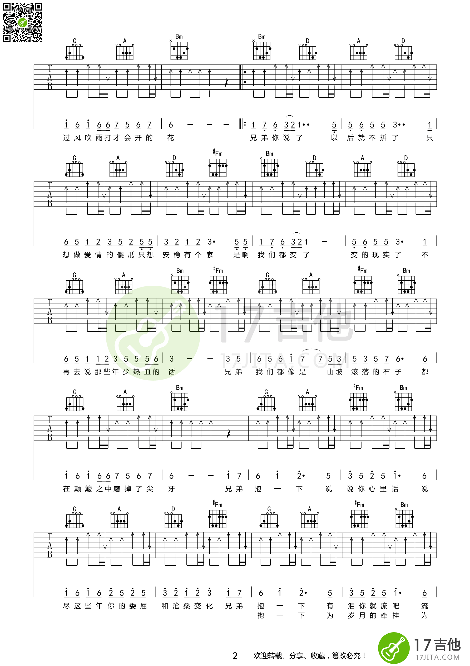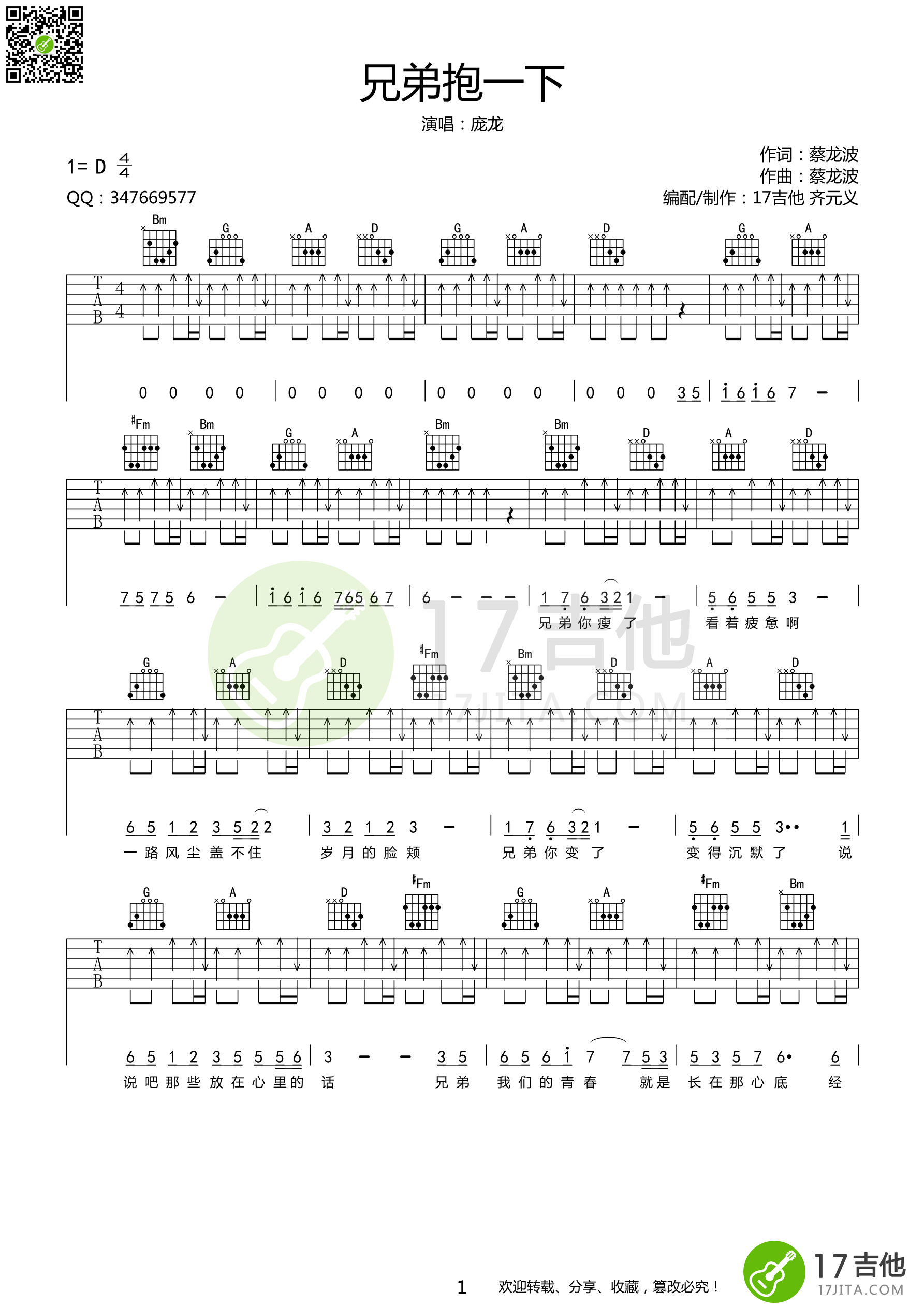 曲谱介绍: 庞龙《兄弟抱一下》吉他弹唱谱,共有3张高清图谱。