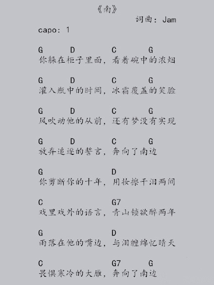 曲谱介绍: Jam(阿敬)《南》吉他弹唱谱,共有1张高清图谱,免翻页排版设计。