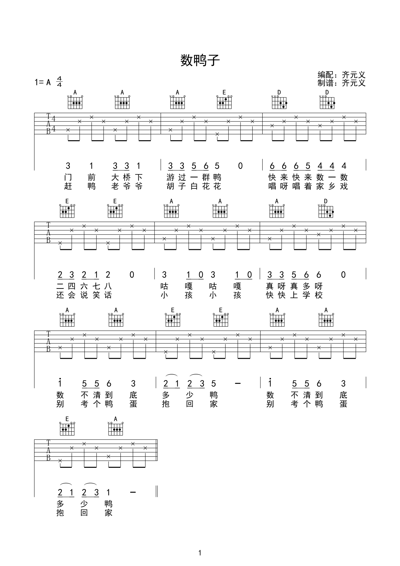 曲谱介绍: 儿童歌曲《数鸭子》吉他弹唱谱,共有1张高清图谱,免翻页排版设计。