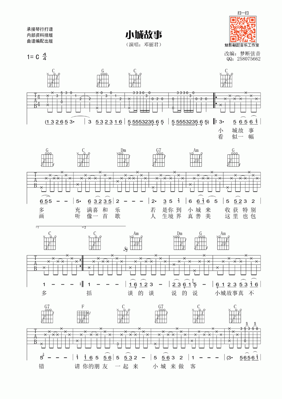 曲谱介绍: 邓丽君《小城故事》吉他弹唱谱,共有2张高清图谱,免翻页排版设计。