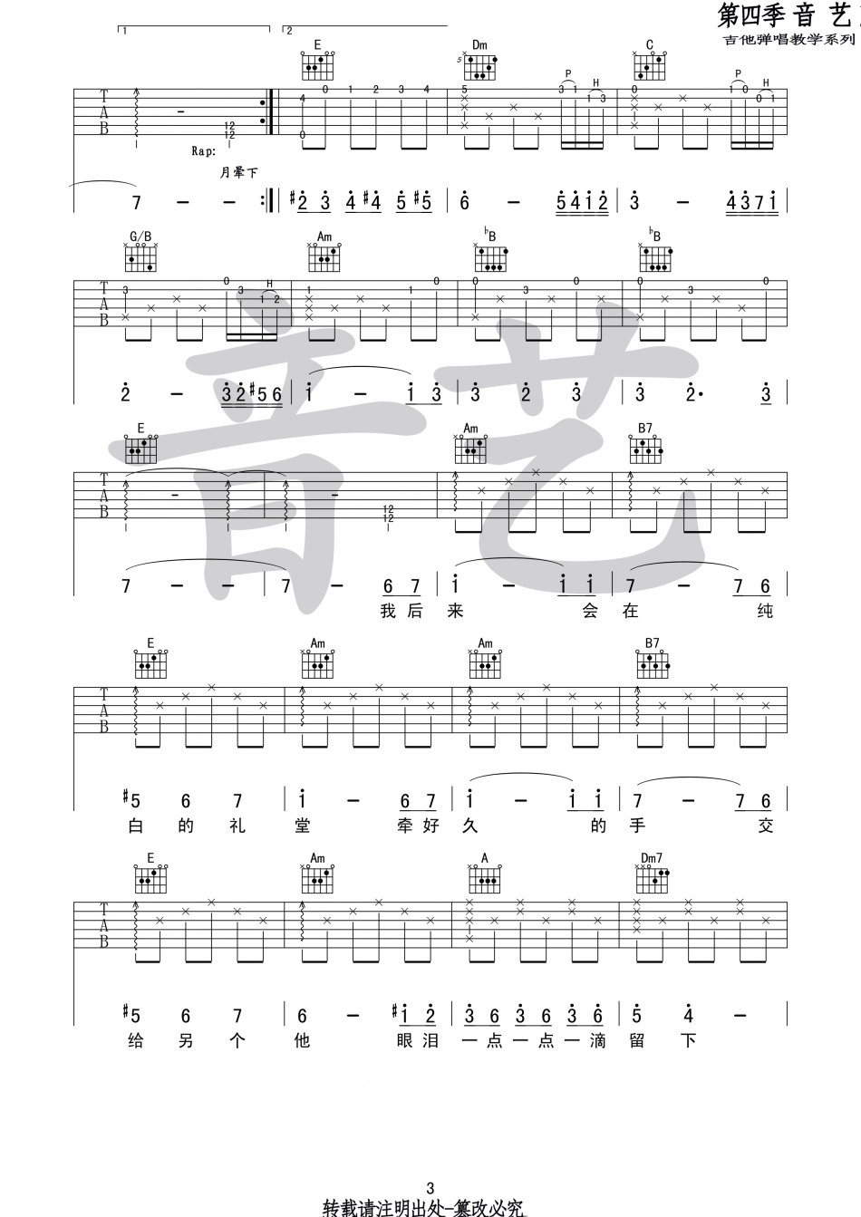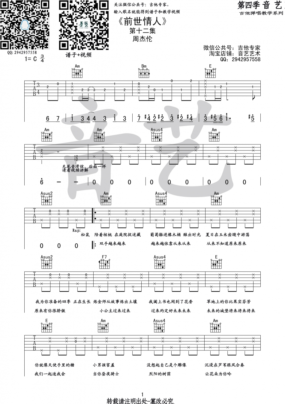 曲谱介绍: 周杰伦《前世情人》吉他弹唱谱,共有4张高清图谱。