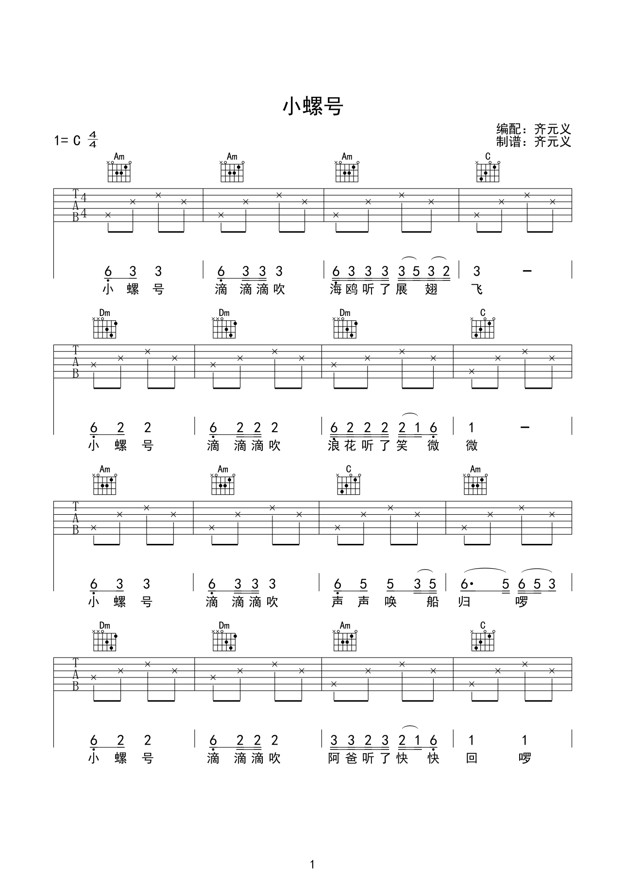 小螺号吉他谱 - 儿童歌曲 - 吉他弹唱谱