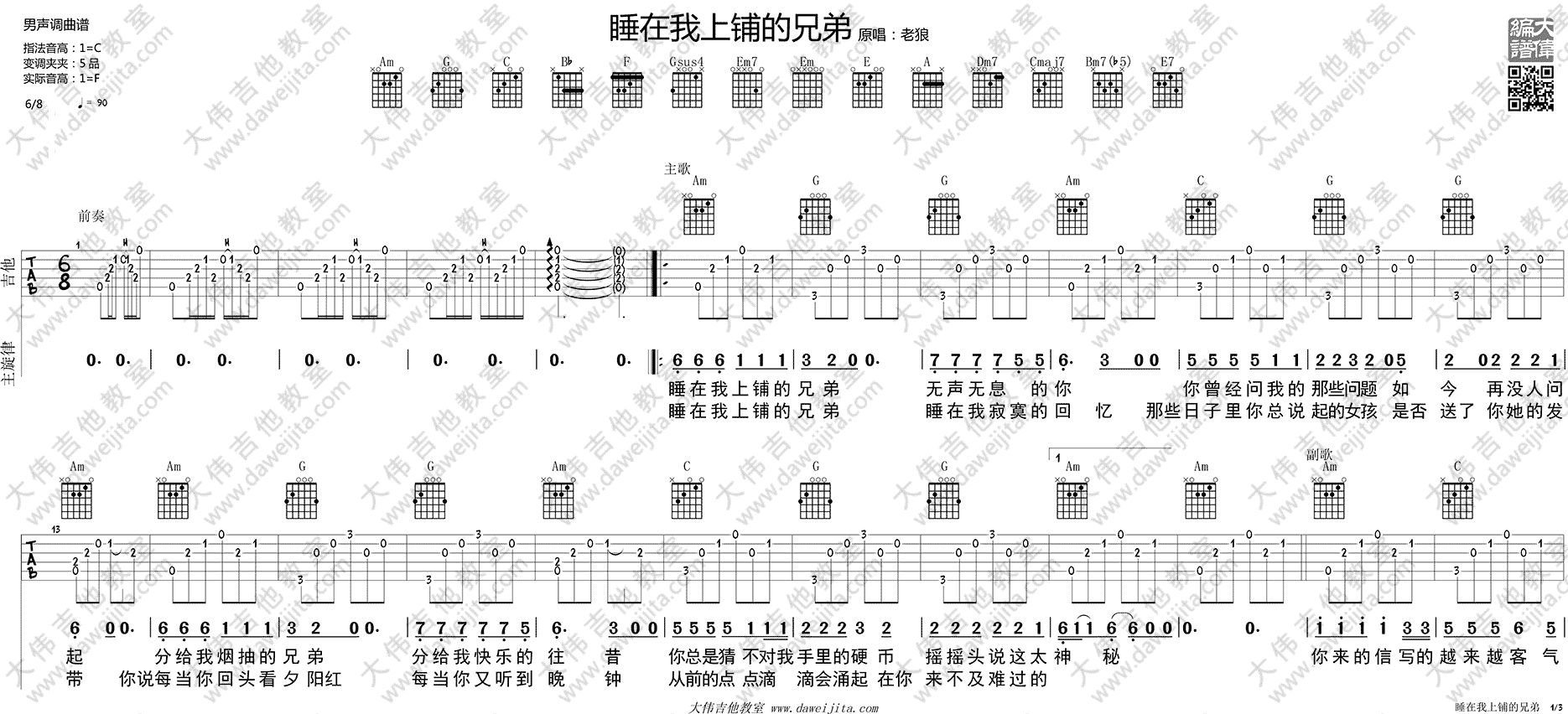 曲谱介绍: 老狼《睡在我上铺的兄弟》吉他弹唱谱,采用C调指法编配,共有3张高清图谱。