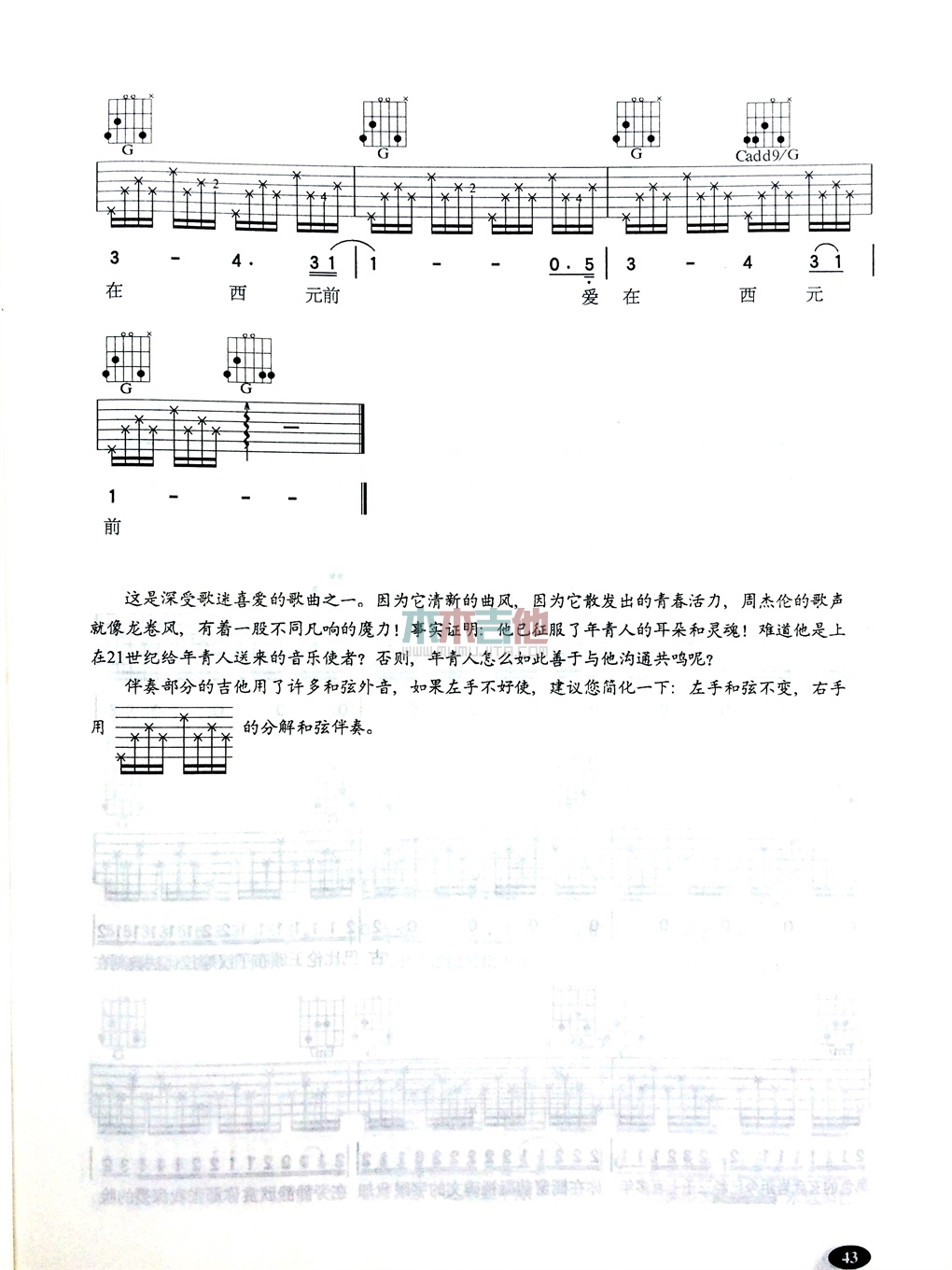 曲谱介绍: 周杰伦《爱在西元前》吉他弹唱谱,共有5张高清图谱。