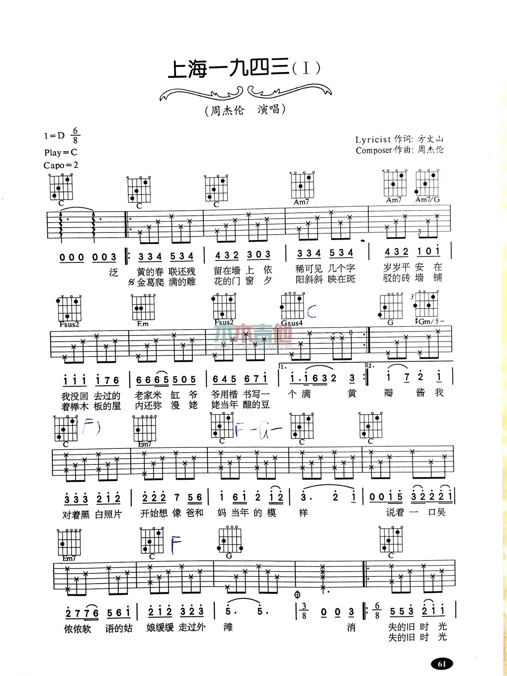 曲谱介绍: 周杰伦《上海一九四三》吉他弹唱谱,共有3张高清图谱。