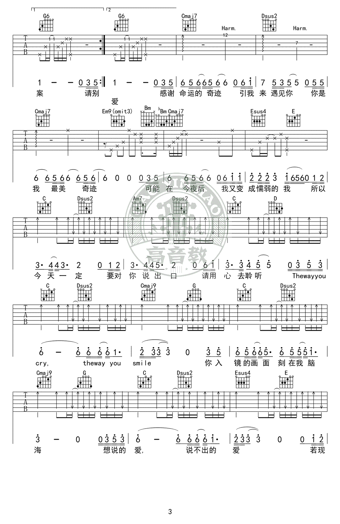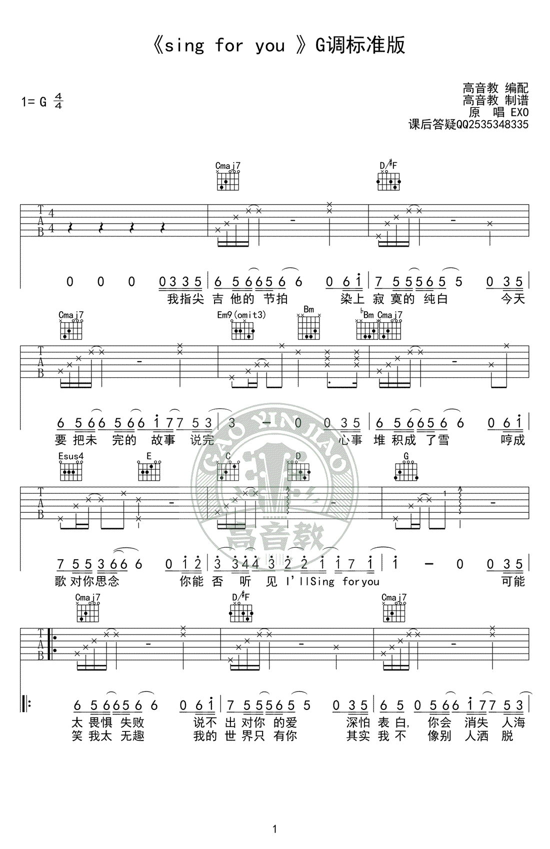曲谱介绍: EXO《sing for you》吉他谱,G调标准版,Sing For You吉他六线谱, 为你而唱中文版本歌词,弹唱谱高清版,共四张图片谱例,高音教编配,91吉他谱网站上传分享。 EXO冬季特别专辑的抒情歌曲《Sing For You》,歌词和剧情有些令人伤怀,吉他搭配感性的声音,诉说内心的爱意,给人以慰藉~