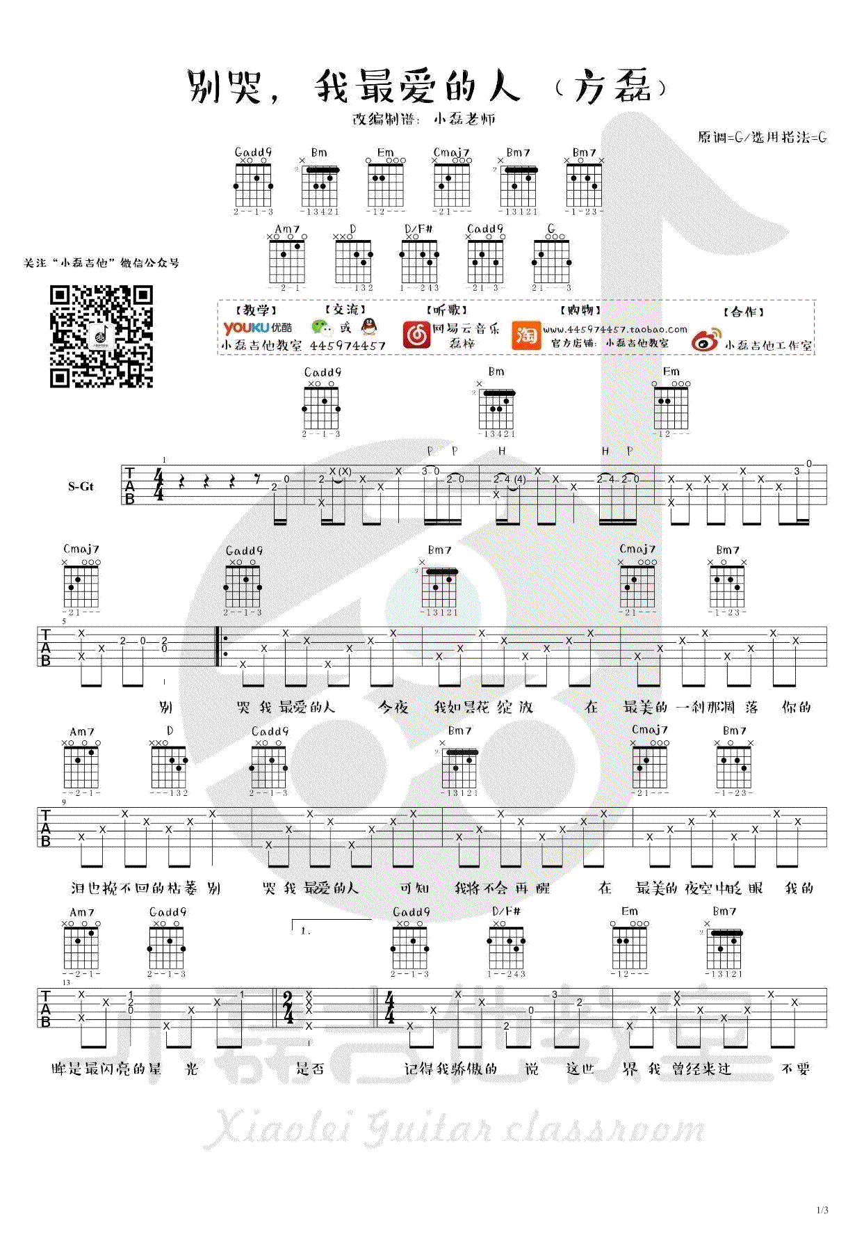 曲谱介绍: 别哭我最爱的人吉他谱,郑智化的经典老歌,G调指法,别哭,我最爱的人吉他六线谱,三张高清图片谱例。感谢小磊老师编配分享,并为琴友们带来吉他弹唱演示视频。 小磊吉他弹唱说明:这首歌原版是郑智化的,我改编自方磊在某节目里的版本,老师这个乐谱尽可能还原现场版的配器!比如葫芦丝,吉他等。原版可能略微高一些,所以在示范的时候降半音调弦进行弹唱,会舒服很多。嗓音条件不是特别好的同学,也可以降全音!