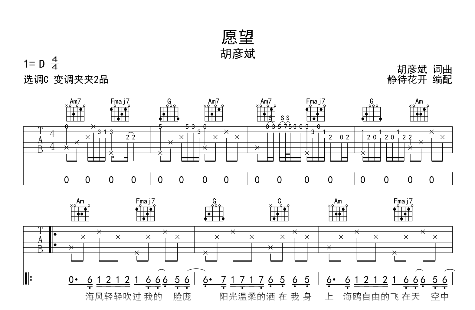 曲谱介绍: 愿望吉他谱,胡彦斌演唱,《愿望》吉他弹唱谱,原调为D调,本谱采用C调和弦指法编配,建议夹变调夹2品,也可以根据自己嗓音找到一个舒服的位置,速度为80拍每分钟,演奏难度初级。 这经典的旋律真的绝了。我想让自己许个愿望,抓个星星坐在月亮上。朗朗上口的旋律分分钟收入歌单中。