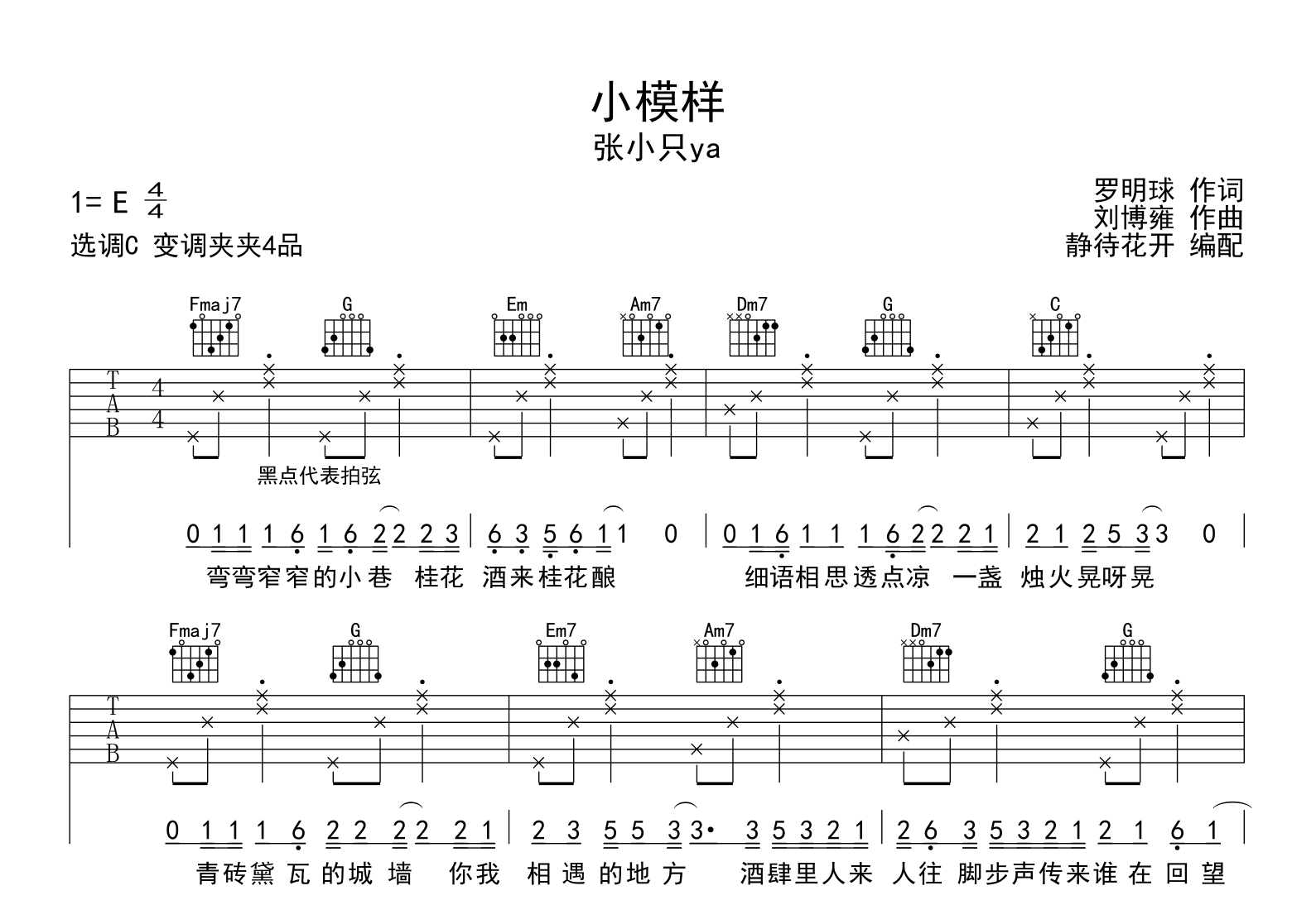 曲谱介绍: 小模样吉他谱,张小只ya,《小模样》吉他弹唱谱,原调E,采用C调和弦指法编配,速度为80拍每分钟,建议夹变调夹4品,也可根据个人嗓音找到一个舒服的位置,演奏难度初级。