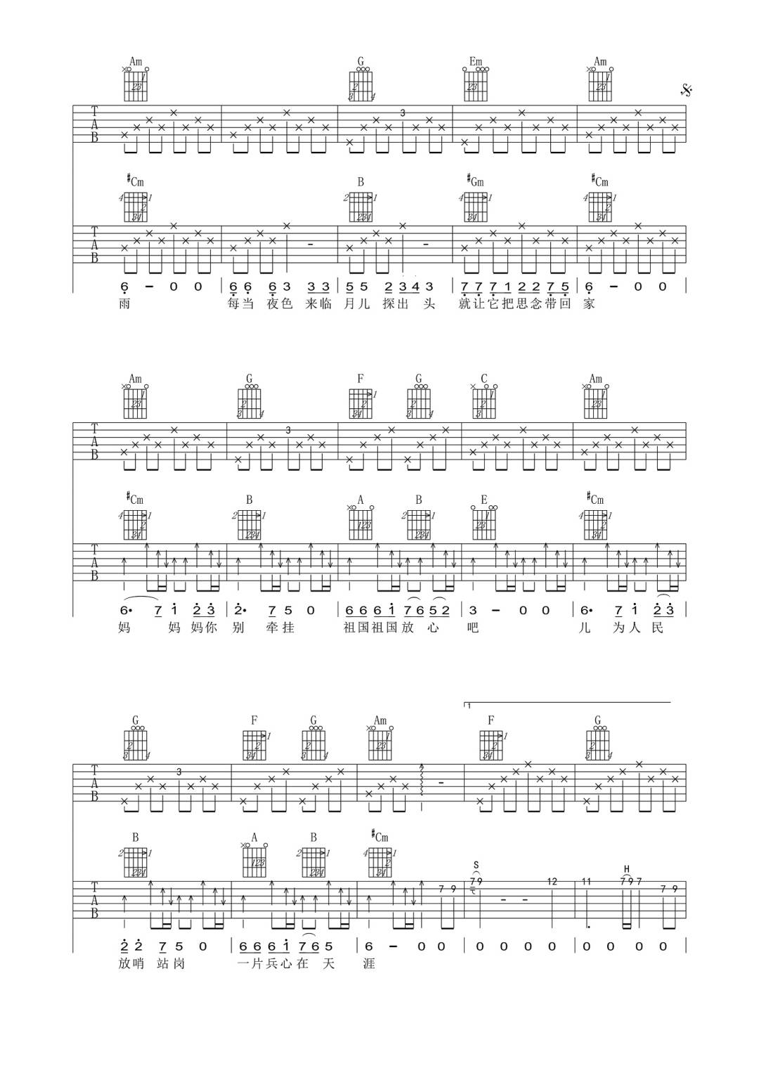 曲谱介绍: 吉他谱介绍:兵心吉他谱,阿振演唱的一首歌曲,4/4拍的节奏,这首歌曲的原调为E调,这里曲谱采用了C调指法进行编配,演唱时夹变调夹4品可回到原调,也可根据个人实际嗓音情况选择。曲谱由琴谱网更新上传,共3张高清图片弹唱吉他谱例,曲谱来源于网络转载,编配制谱者暂不详。这首好听的军歌,抒发了一个当兵人的心声,婉转动听的旋律,唱出多少退伍老兵的回忆。