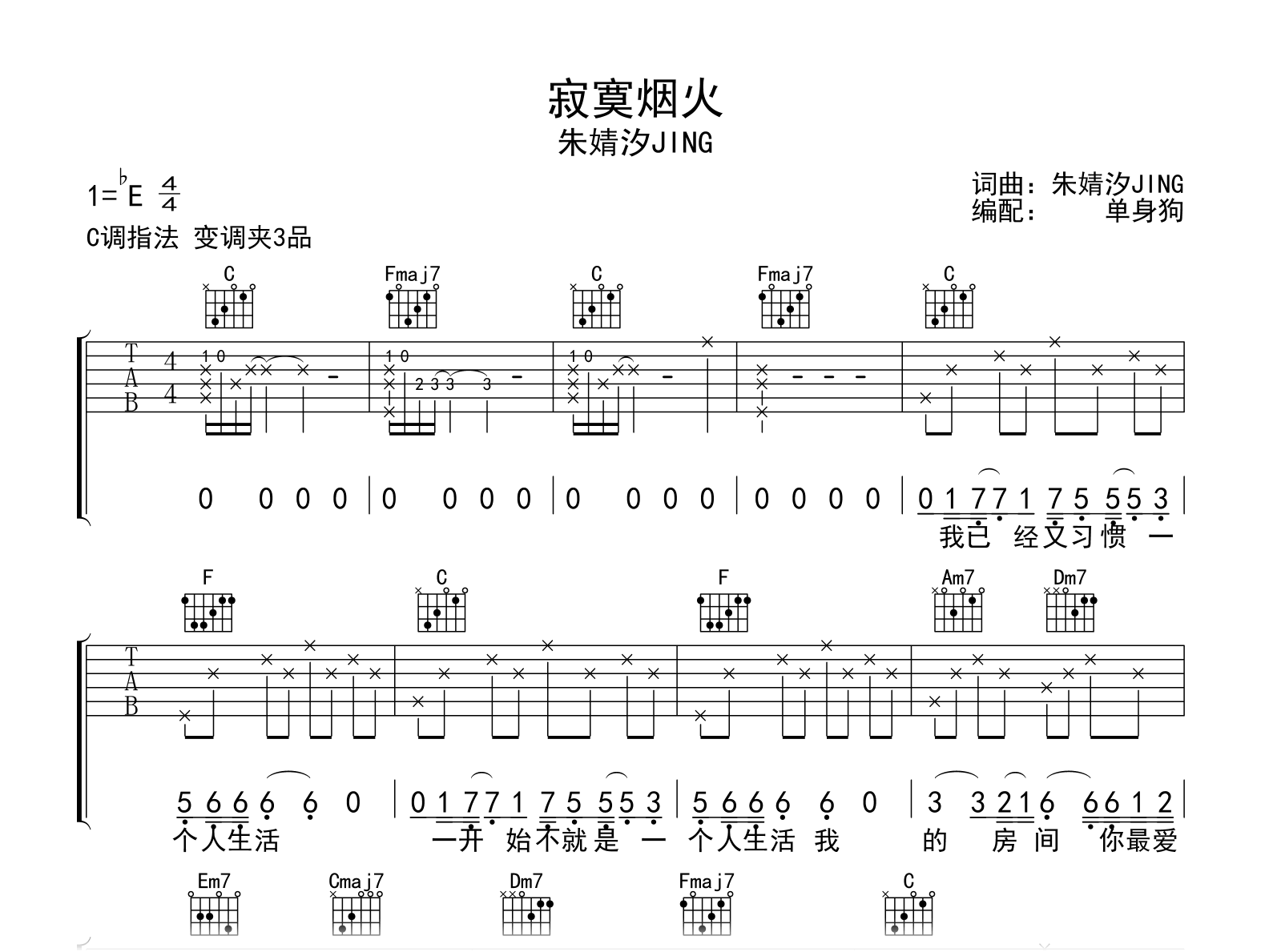 曲谱介绍: 寂寞烟火吉他谱,朱婧汐词曲创作演唱,歌声娓娓道来,陪伴你在每一个寂寞的夜里。《寂寞烟火》吉他弹唱谱,原调bE,选用C调和弦指法,变调夹夹三品,完整版编配共三张高清图片谱。