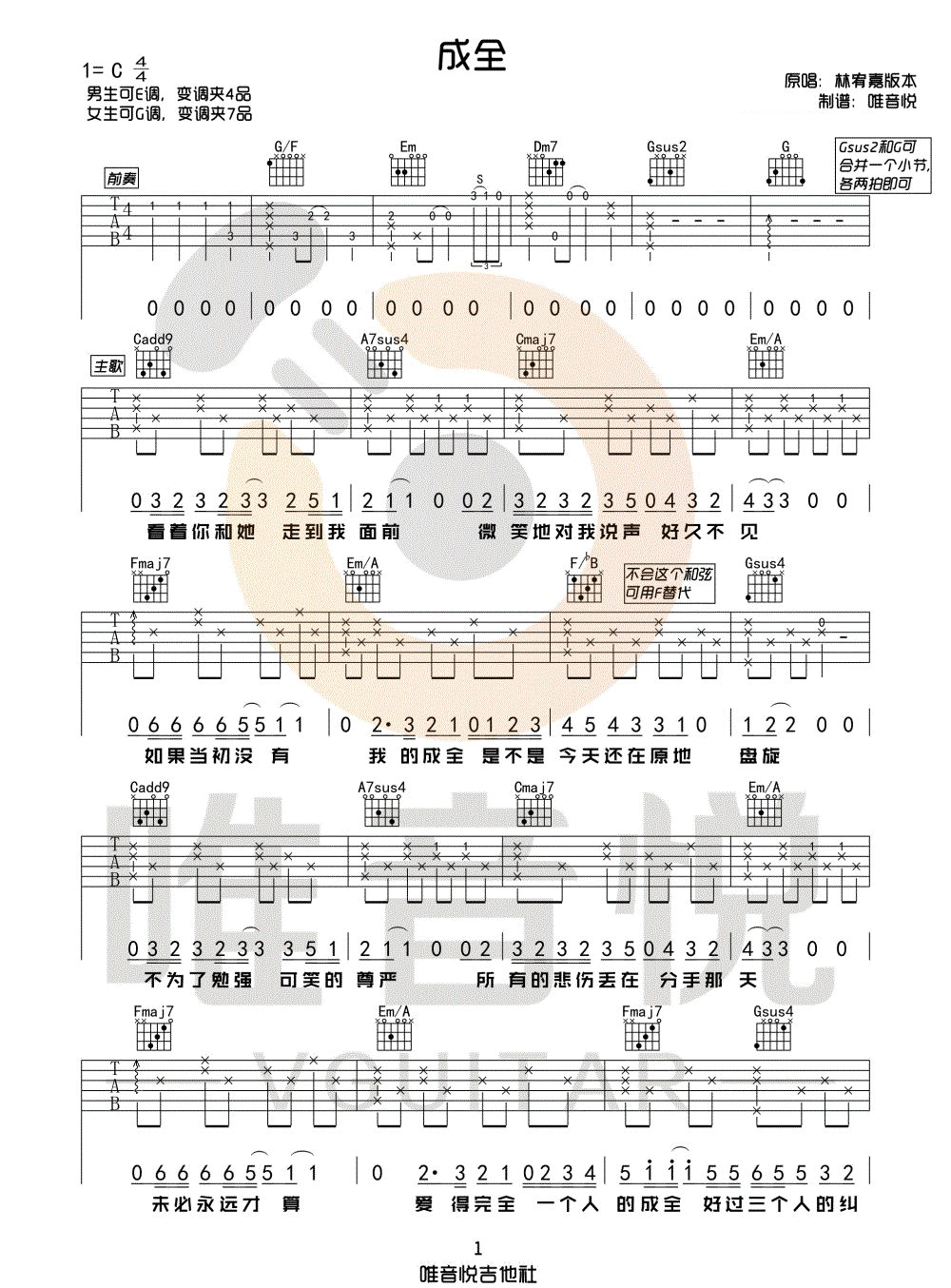 曲谱介绍: 成全吉他谱_林宥嘉_《成全》C调原版弹唱六线谱_高清图片谱分享,《成全》是由刘若英演唱的一首歌,林宥嘉在《蒙面唱将猜猜猜》上翻唱过这首歌,相比于刘若英唱《成全》这首歌时的洒脱,林宥嘉更像是一个被伤透了心的倾诉者。那你是更喜欢哪位歌手唱的《成全》呢? 此版本的曲谱来源于唯音悦吉他社扒谱制谱,这里歌曲采用C调指法根据林宥嘉原版进行编配,演唱时男生可夹4品,女生夹7品演唱。这首歌整体难度不大,难度主要集中在前奏及尾奏上, 相对其他部分有些复杂,需要花时间练习。 成全吉他谱_林宥嘉_《成全》C调原版弹唱六线谱_高清图片谱1: