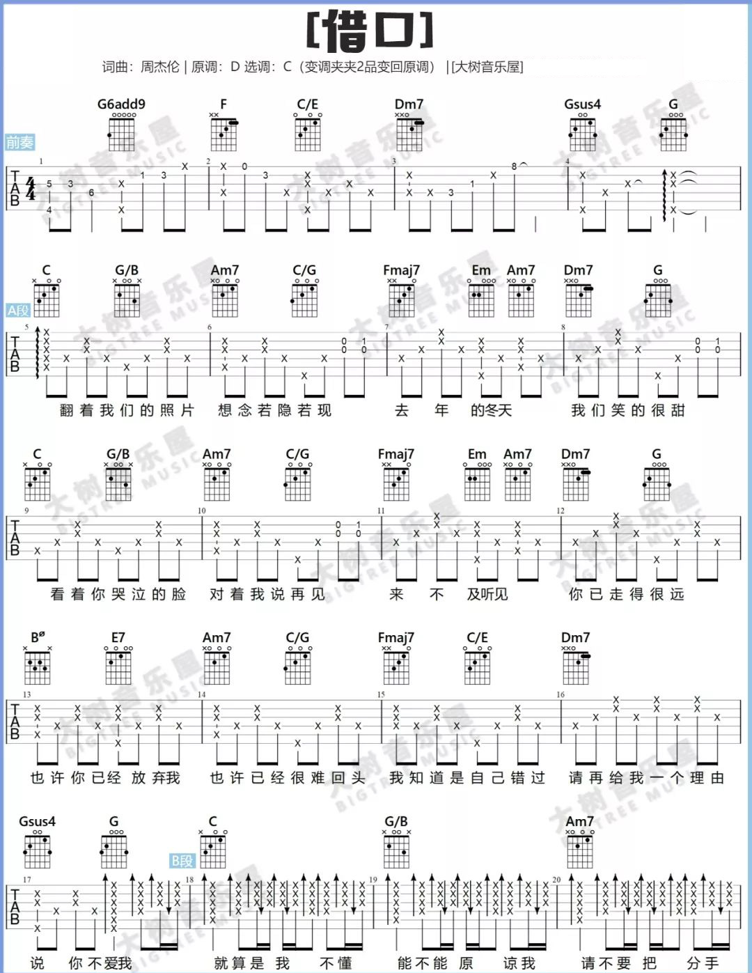 曲谱介绍: 借口吉他谱_周杰伦_《借口》C调原版六线谱_吉他弹唱教学分享,《借口》是由周杰伦创作的一首经典情歌,歌曲灵感是来自于歌迷的心情故事,由于许多歌迷经常写信给周杰伦,分享自己的爱情故事,信件里有许多失恋的痛苦与不舍。周杰伦希望借这首歌,鼓励歌迷们勇敢追求自己的爱情,不要轻易地放弃。 此版本的曲谱及教学来源于大树音乐屋出品,歌曲原调为D调,这里采用了C调指法根据原版进行编配,演唱时夹变调夹2品回到原调。歌曲编配难度不大,前奏部分很好的还原了原曲的旋律,不懂的地方可以参考吉他弹唱教学视频。 借口吉他谱_周杰伦_《借口》C调原版六线谱_吉他弹唱教学视频:   借口吉他谱_周杰伦_《借口》C调原版吉他弹唱六线谱_高清图片谱1: