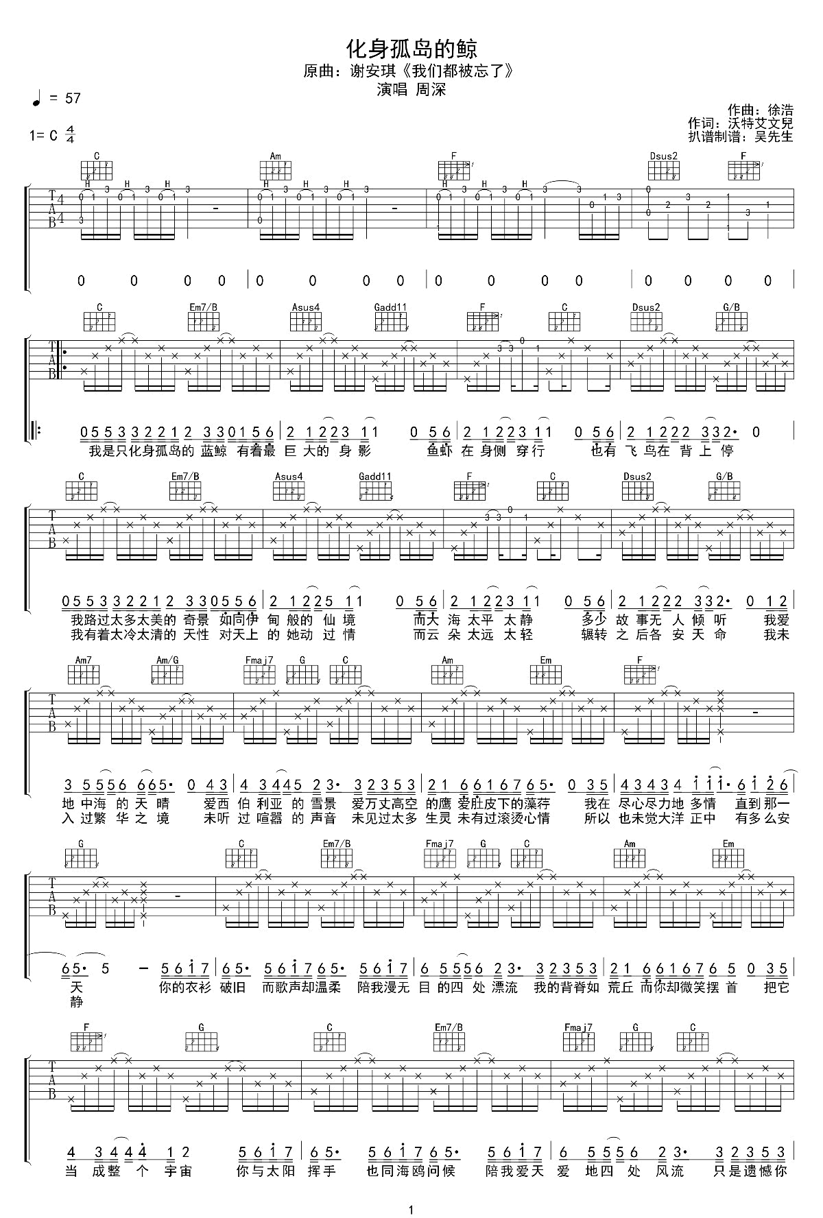 曲谱介绍: 《化身孤岛的鲸》吉他谱_周深_C调原版弹唱六线谱_高清图片谱分享,《化身孤岛的鲸》是由周深演唱的一首歌,这首歌改编自香港歌手谢安琪演唱的歌曲《我们都被忘了》,周深用他优美的嗓音重新诠释了这首歌。 此版本的曲谱来源于吴先生扒谱制谱,这里歌曲采用了C调指法根据原版进行编配,演唱时可根据自己的嗓音情况夹变调夹。这首歌编配有一定难度,前奏存在一些连续的击弦技巧,后面有些切分节奏不是太好把握。 《化身孤岛的鲸》吉他谱_周深_C调原版弹唱六线谱_高清图片谱1:
