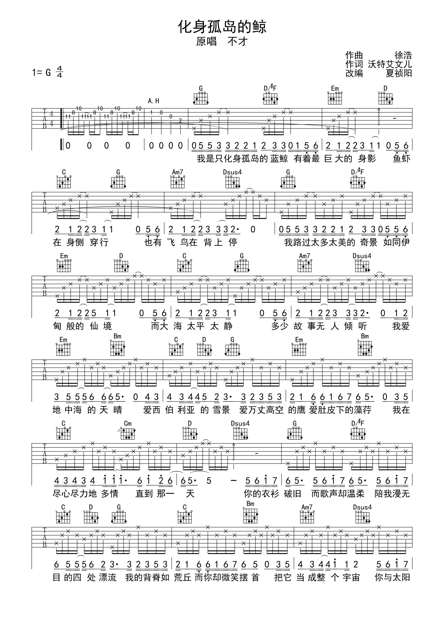 曲谱介绍: 不才《化身孤岛的鲸》吉他谱_C调吉他弹唱谱