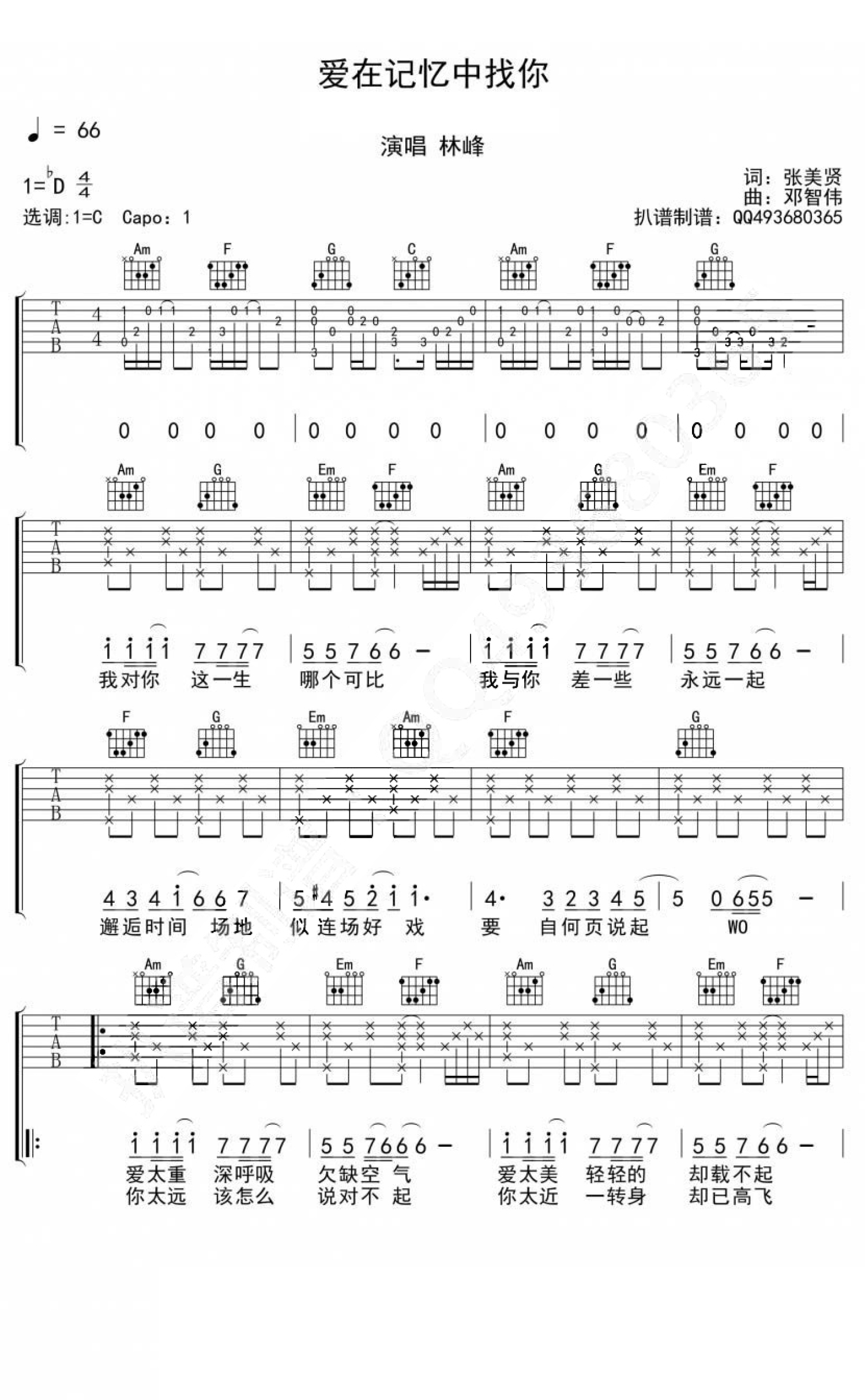 曲谱介绍: 爱在记忆中找你吉他谱_林峰_C调弹唱谱
