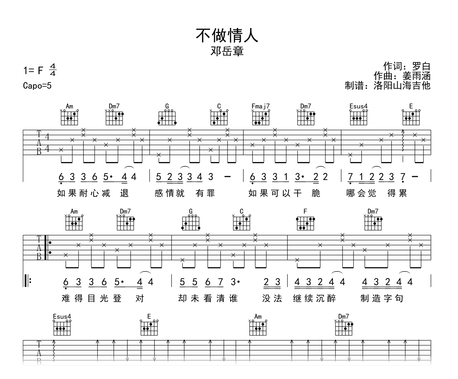 不做情人吉他谱 - 邓岳章 - C调吉他弹唱谱