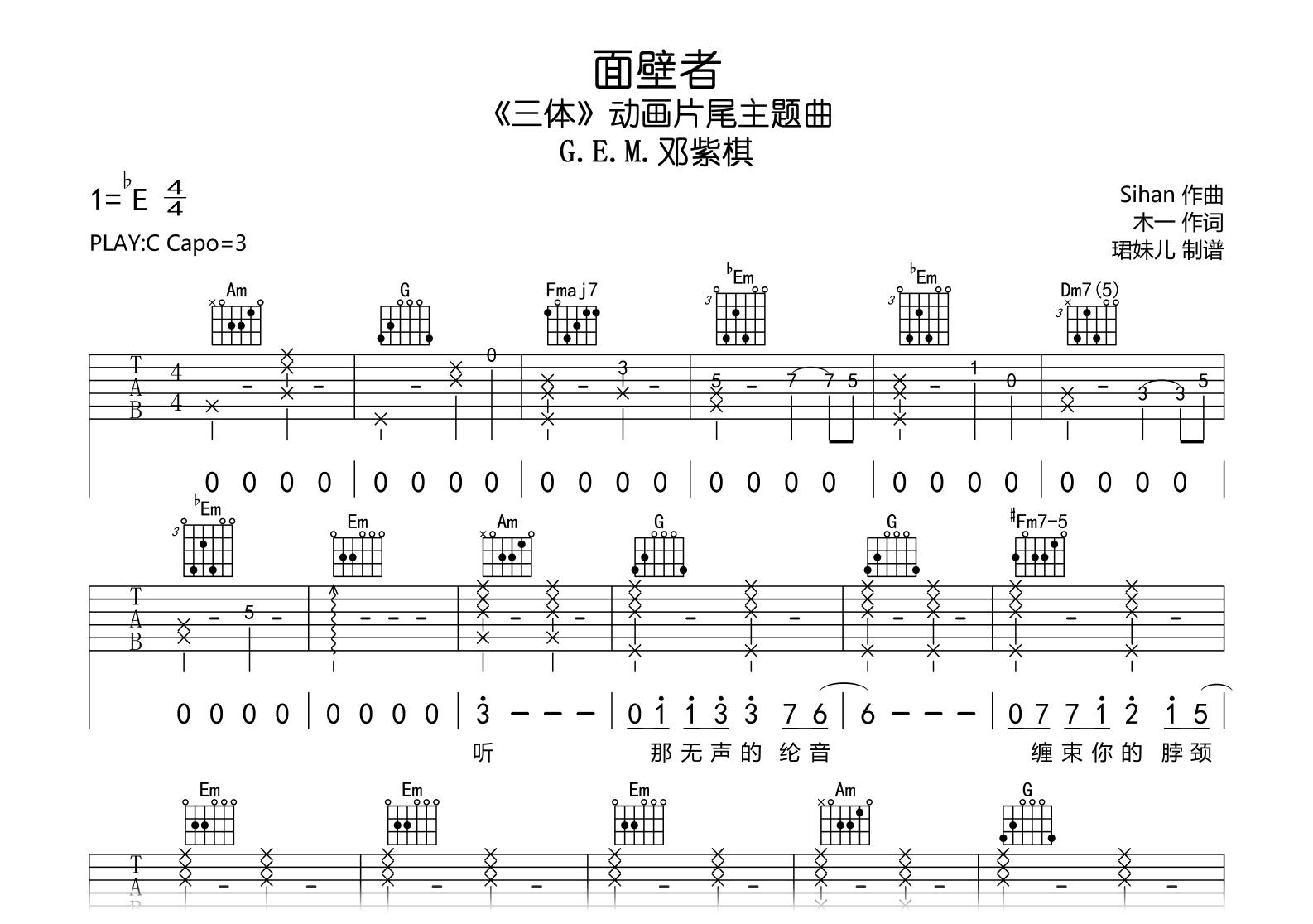 曲谱介绍: 面壁者吉他谱,邓紫棋演唱,动画片《三体》片尾主题曲,《面壁者》吉他弹唱谱,原调为bE调,曲谱采用C调指法编配,变调夹3品,速度85BPM,难度较简单演奏易上手。