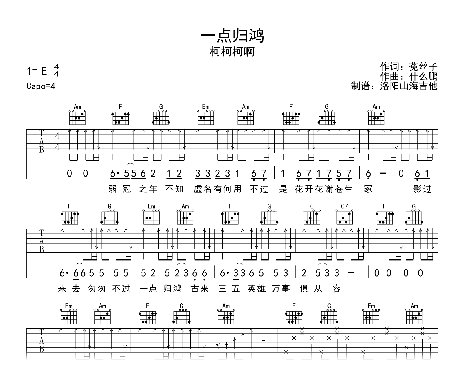 曲谱介绍: 一点归鸿吉他谱,柯柯柯啊演唱,影过来去匆匆,不过一点归鸿。《一点归鸿》吉他弹唱谱,原调E,选用C调和弦指法,Capo夹四品,六线谱共两张高清图片谱例。