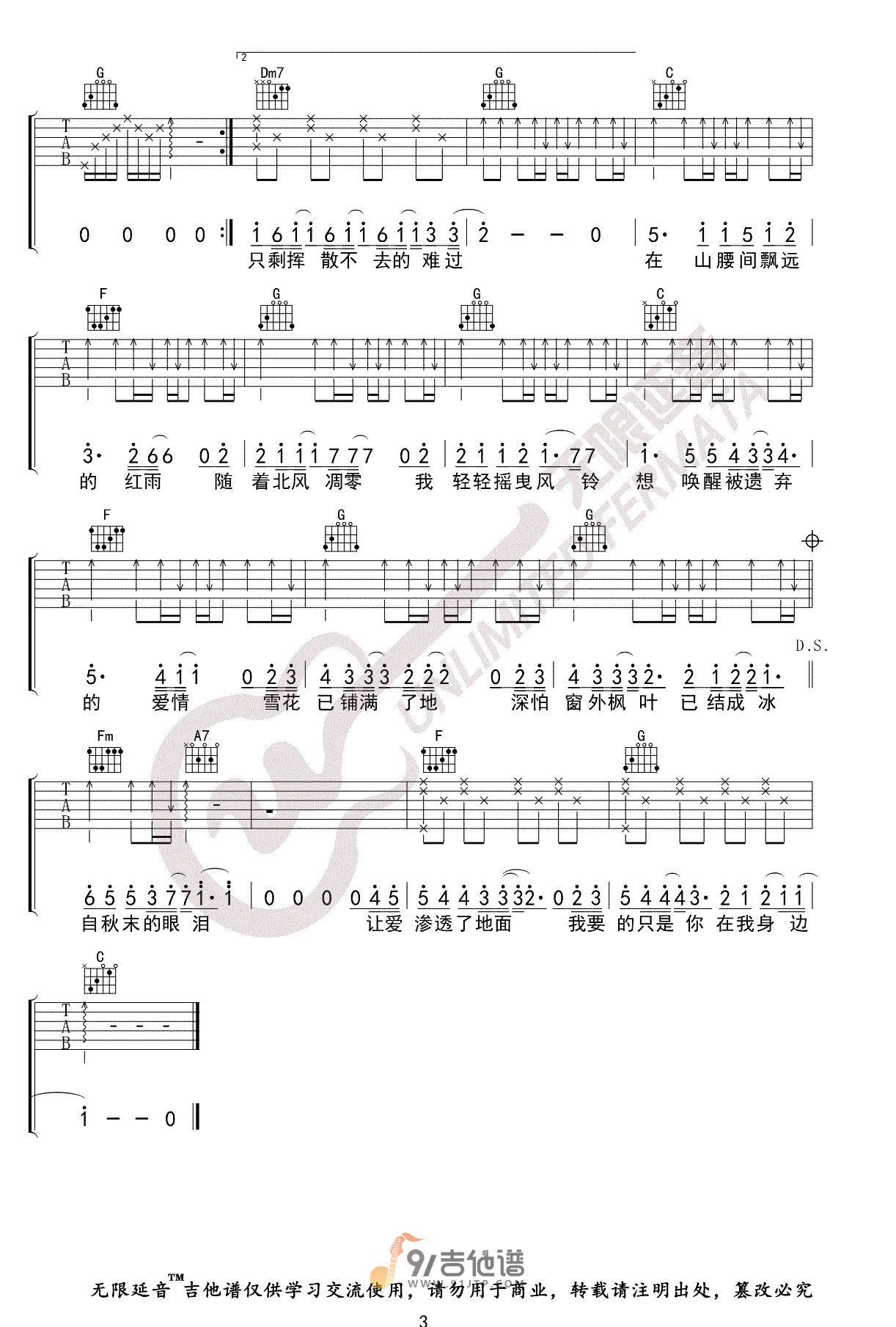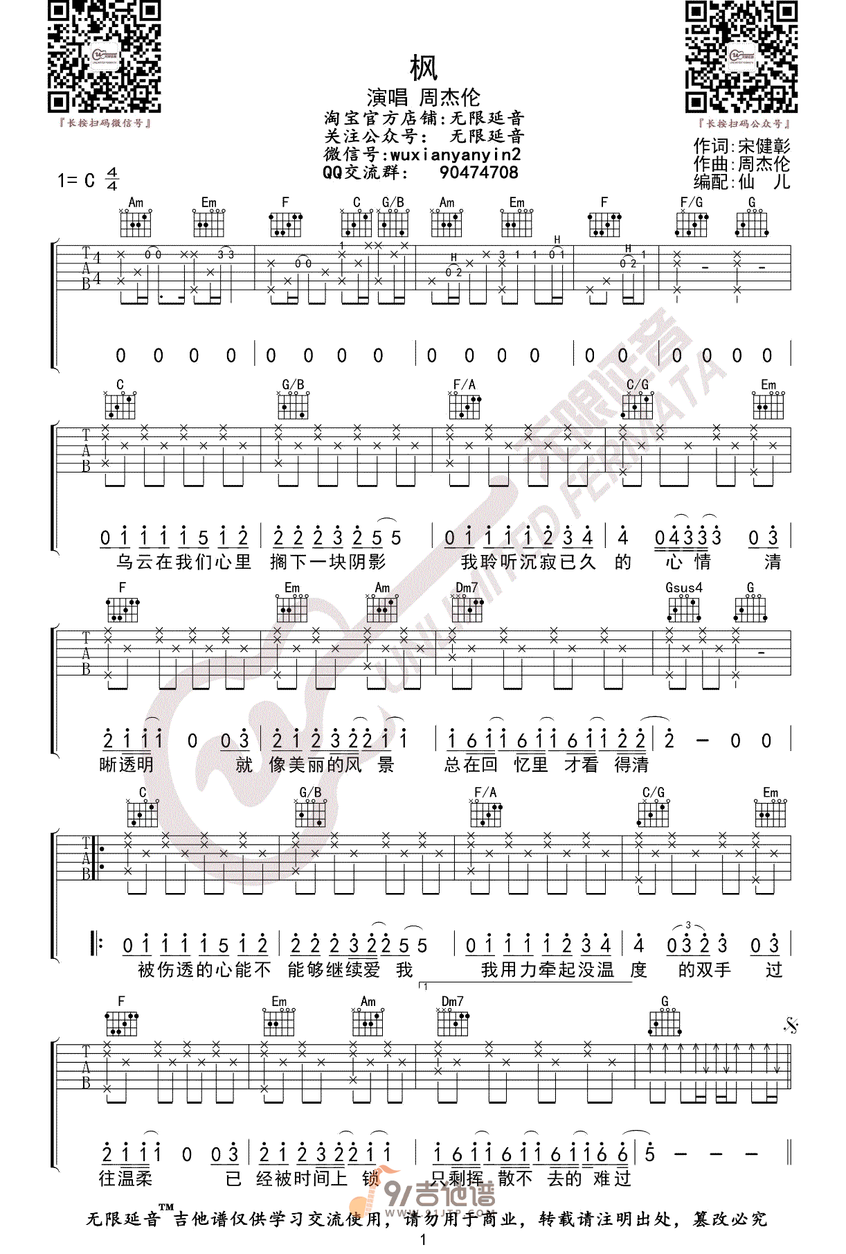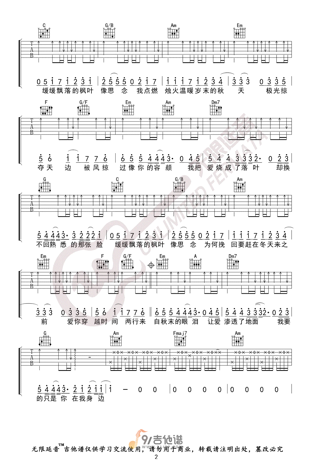 曲谱介绍: 曲谱简介:枫吉他谱,周杰伦演唱的一首歌曲,4/4拍的节奏,这首歌曲的原调为C调,这里曲谱采用了C调指法进行编配,演唱时可不夹变调夹,曲谱由无限延音编配出品。爱情就像枫叶,火红的美丽却又是凋零,缓缓飘落的枫叶像思念,像枫叶一样的爱情,让人惊叹的同时却又心酸。
