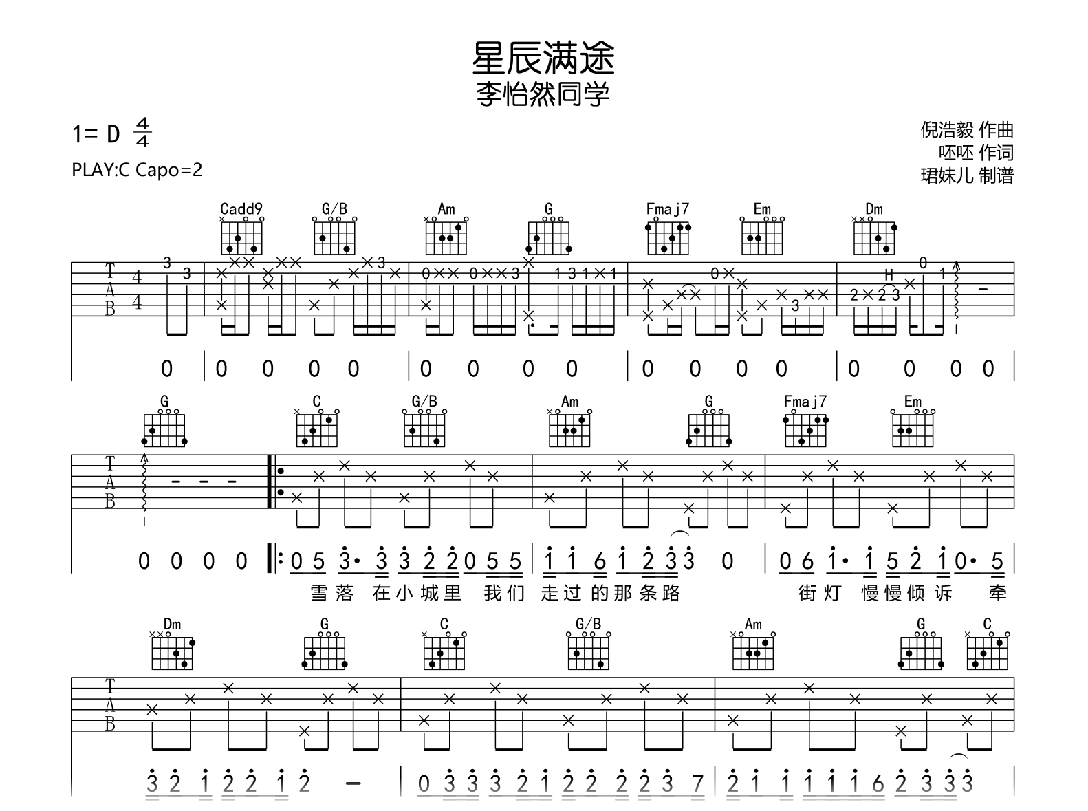 曲谱介绍: 星辰满途吉他谱,李怡然同学演唱,《星辰满途》吉他弹唱谱,原调D,采用C调指法编配,建议变调夹2品,速度85BPM,难度较简单,演奏易上手,高清图片谱共两张谱例。