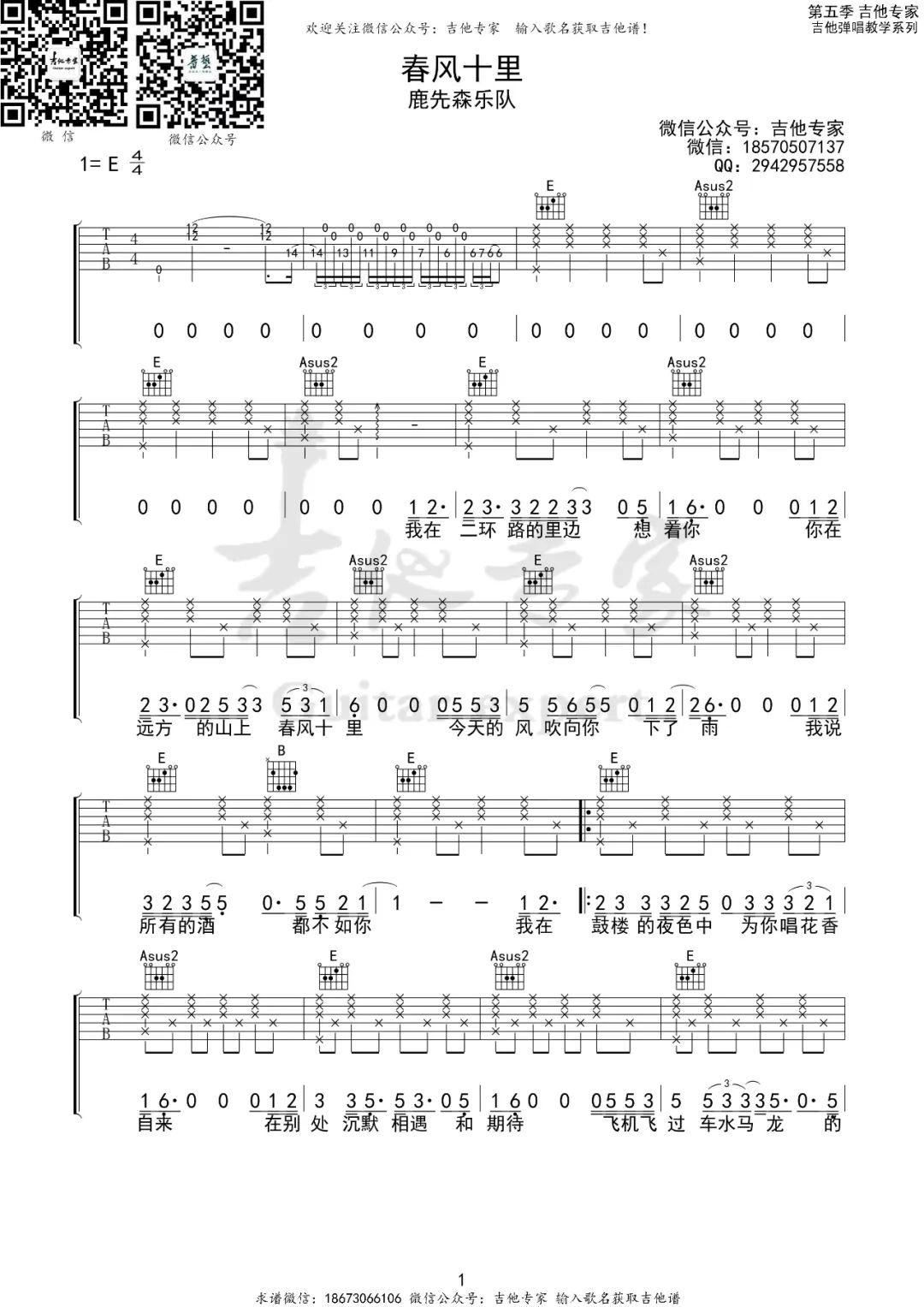 春风十里吉他谱 - 鹿先森乐队 - E调吉他弹唱谱