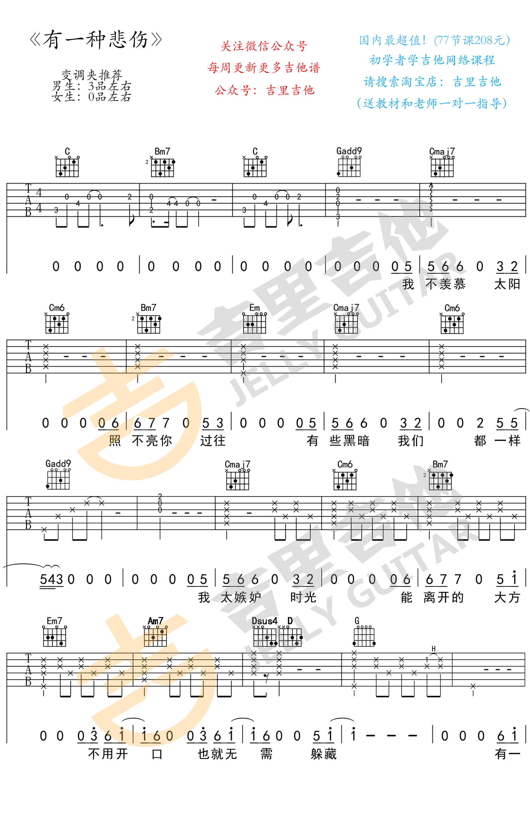 曲谱介绍: 吉他谱介绍:有一种悲伤吉他谱,A-Lin演唱的一首歌曲,4/4拍的节奏,这首歌曲的原调为G调,这里曲谱采用了C调指法进行编配,演唱时可根据个人情况选择变调夹,曲谱由琴谱网更新上传,共2张高清图片弹唱吉他谱例,来源于@吉里吉他编配出品。这首歌是电影《比悲伤更悲伤的故事》的主题曲,她这个版本有着一份伤感又悲壮的情感,加上《比悲伤更悲伤的故事》的电影情节,这歌声有没有触碰到你心底的悲伤? 有一种悲伤吉他弹唱教学