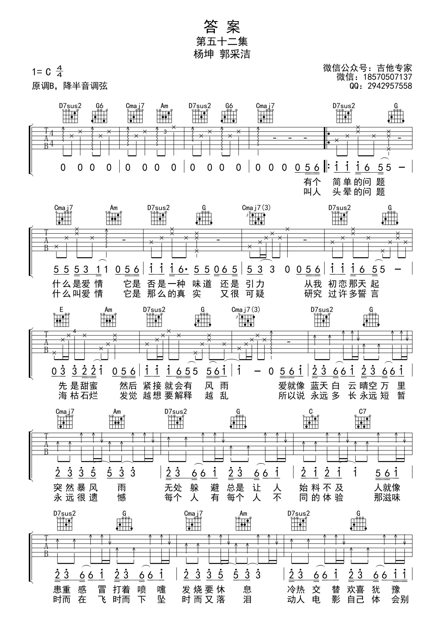 曲谱介绍: 杨坤/郭采洁《答案》吉他谱_C调吉他弹唱谱