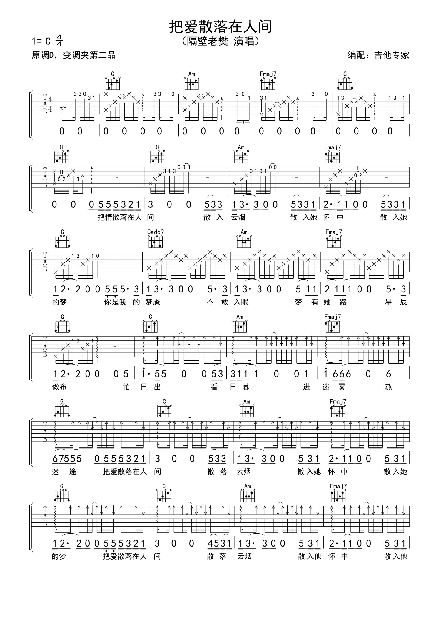 • 把爱散落在人间吉他谱 - 隔壁老樊 - C调吉他弹唱谱第1张