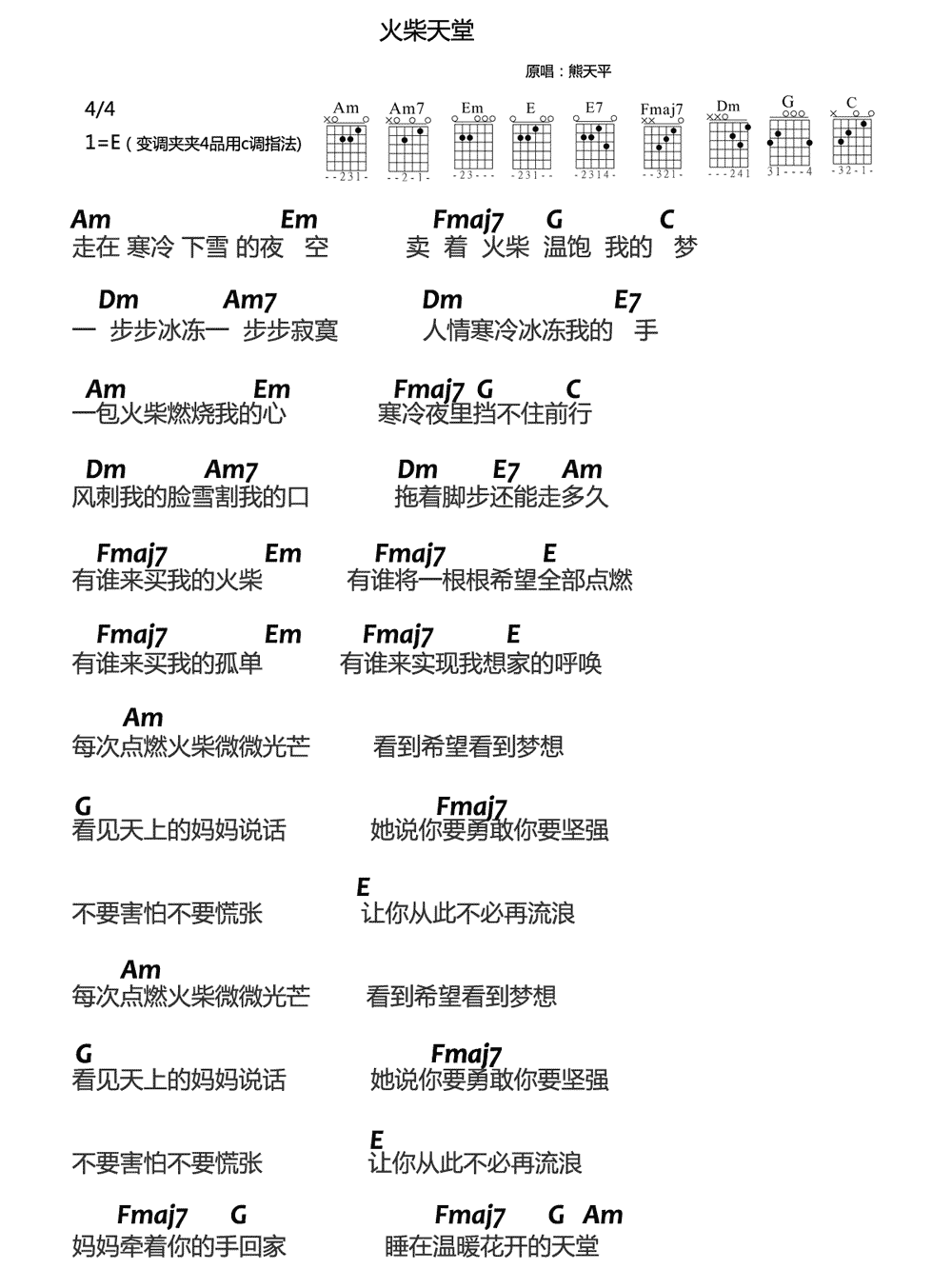曲谱介绍: 熊天平《火柴天堂》吉他弹唱谱,采用E调指法编配,共有1张高清图谱,免翻页排版设计。