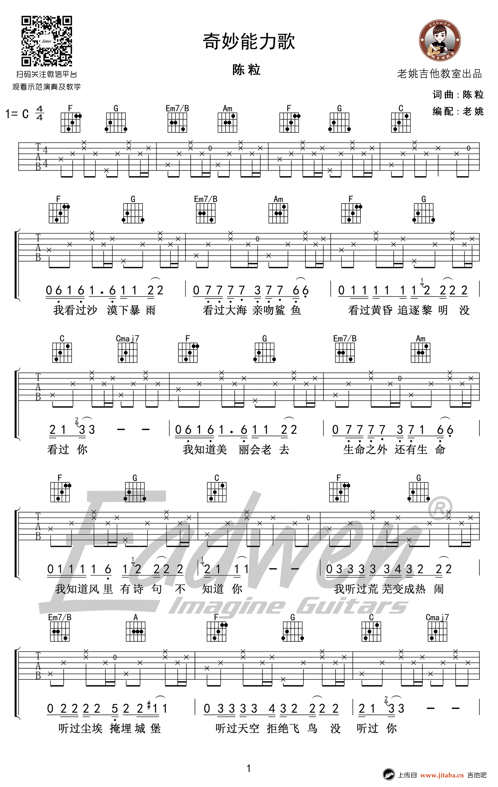 曲谱介绍: 陈粒《奇妙能力歌》吉他谱,C调简单版弹唱谱,随谱附上《奇妙能力歌》吉他教学视频。这首大热歌曲受到众多琴友们的喜爱,编配很简单,非常适合吉他初学者练习。感谢老姚提供曲谱和弹唱教学。 91吉他谱网站是专业曲谱和吉他教学网站,本站已经开通微信公众号的找谱功能,欢迎大家通过:jitabacn 微信公众号来学习和交流。