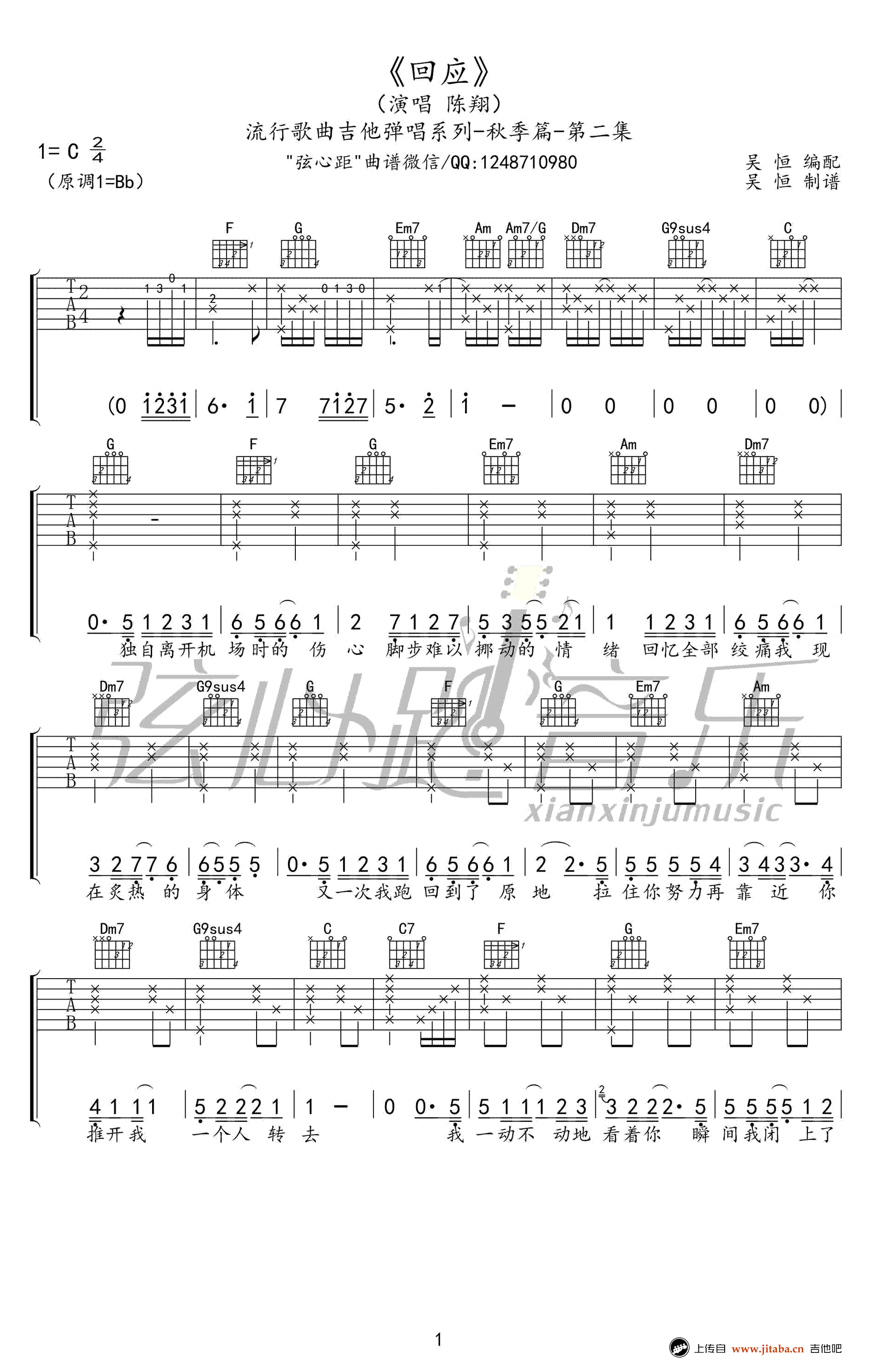 曲谱介绍: 回应吉他谱,C调弹唱谱,陈翔演唱的一首好听的歌曲,收录于《初告白》专辑里面,回应六线谱,高清图片谱,三张谱例。感谢弦心距出品,吴恒编配制谱,91吉他谱网站上传分享。 快男出道的歌手,很多已经淡出了舞台和视野,不过,有些动听的歌声,依然回应在我们的脑海。清澈的嗓音,感伤的旋律,在爱情难以继续的时候,一个人离开的心碎场景……