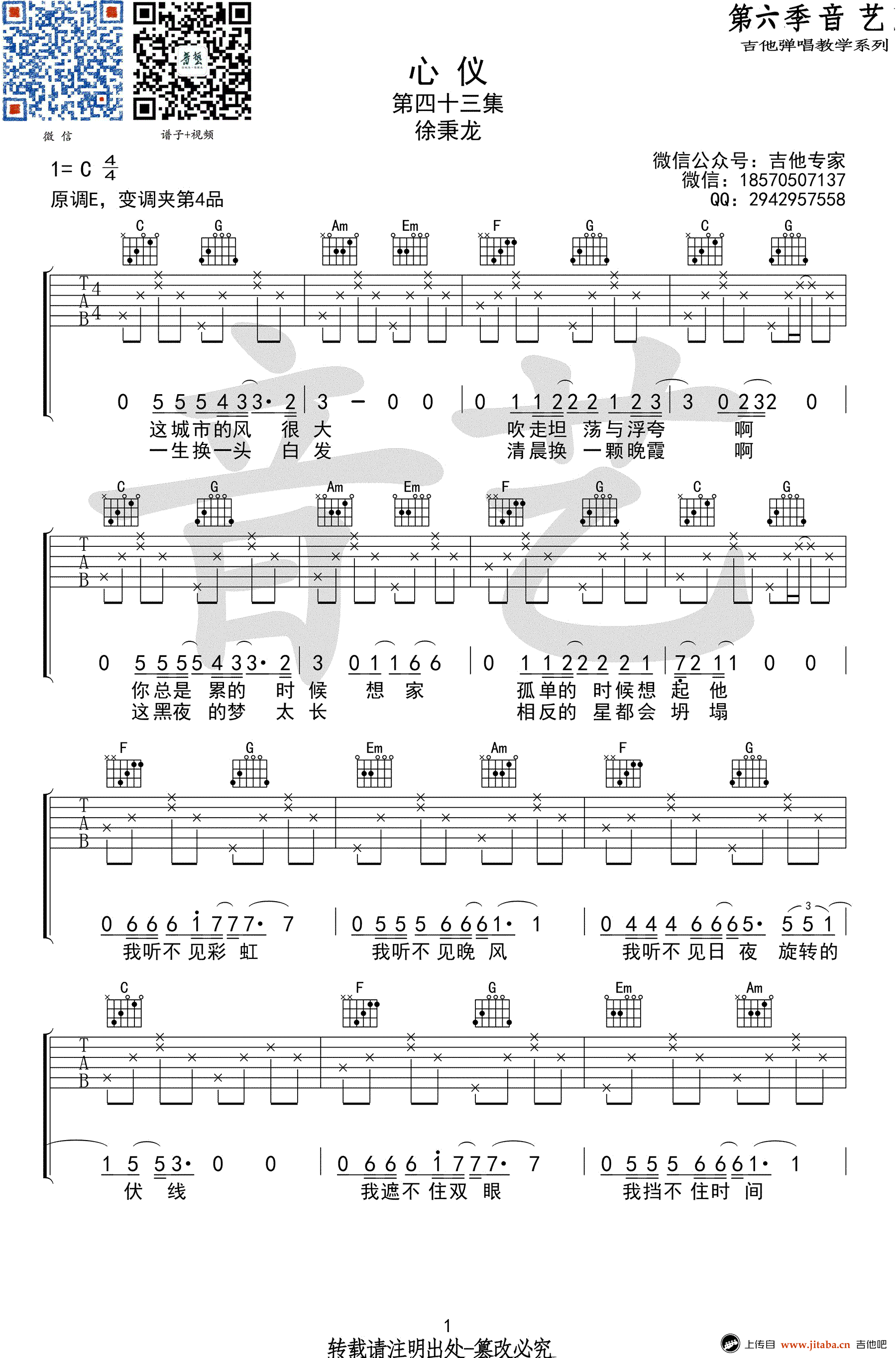 曲谱介绍: 心仪吉他谱,徐秉龙词曲演唱的的一首原创民谣歌曲,原调E,变调夹夹四品,选用C调指法,《心仪》六线谱,原版弹唱谱,高清图片谱。音艺吉他出品,91吉他谱网站整理上传。