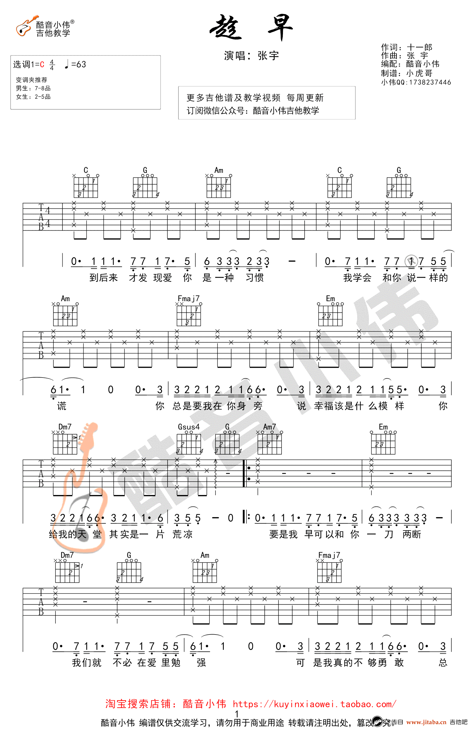 曲谱介绍: 趁早吉他谱,张宇的一首经典老歌,趁早吉他弹唱谱,高清图片谱,本曲谱为C调简单版,变调夹男生7-8品,女生2-5品。感谢小伟老师编配分享,91吉他谱网站为琴友们上传收藏。 一首苦情歌曲,伤感的歌声中,爱与无奈被诠释的淋漓尽致。放弃一个人,是为了离开一种生活,当ta不再适合你的时候,你百般不适应的时候,要先问一问自己哪里做的不对,如果自己没变那一定就是对方变了,不如离开,要趁早。
