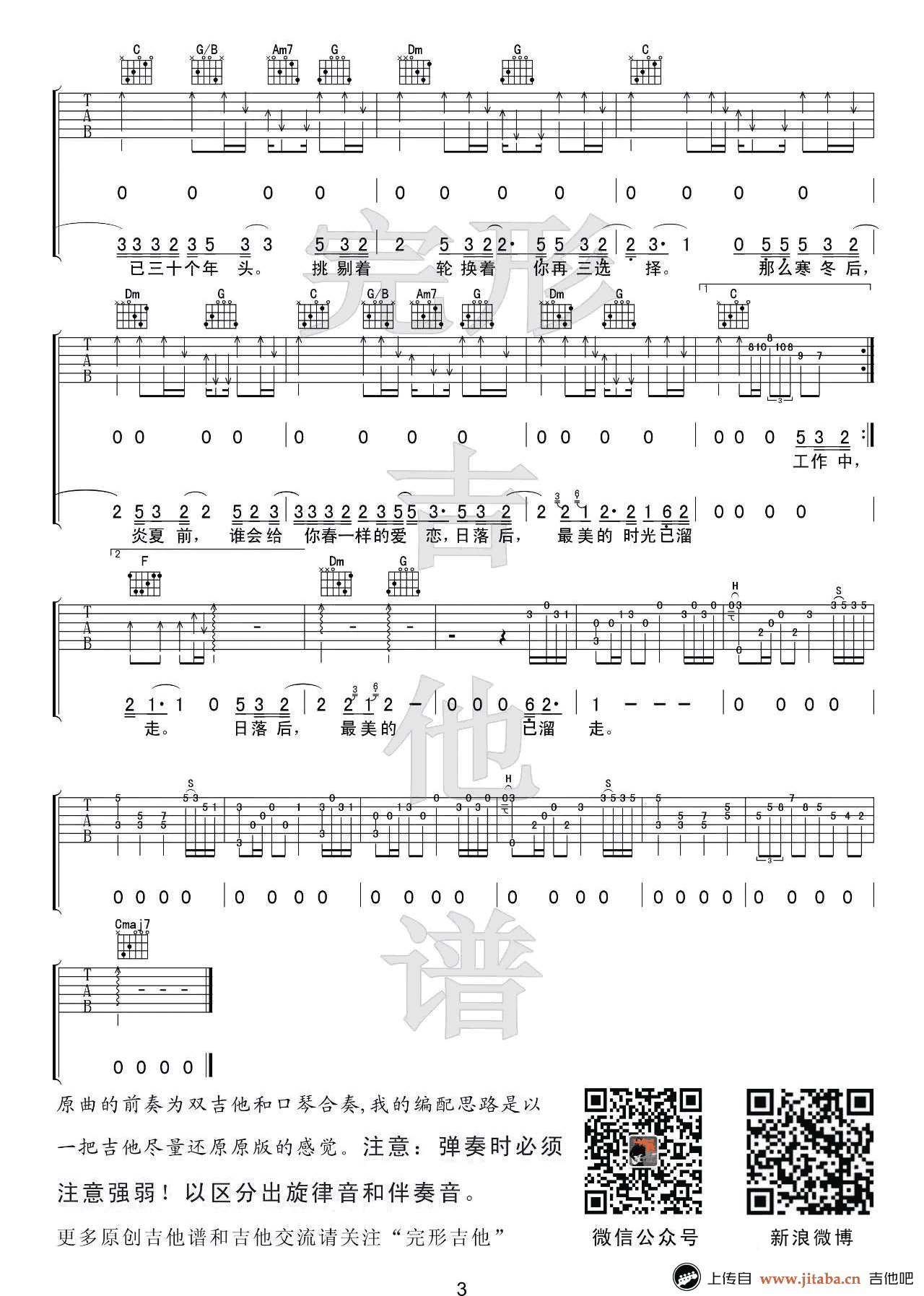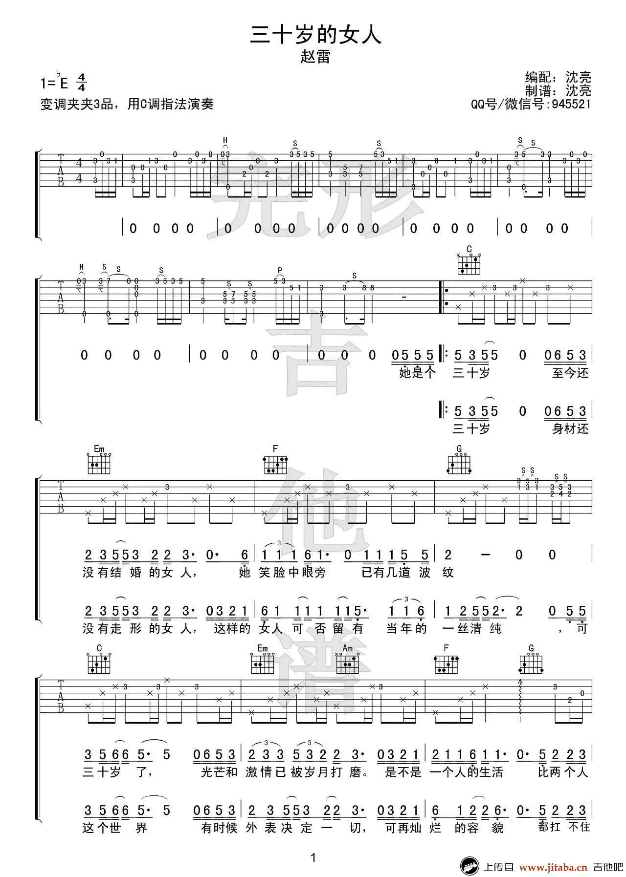 曲谱介绍: 赵雷《三十岁的女人》吉他谱,C调指法演奏,变调夹夹三品。三十岁的女人六线谱,高清弹唱谱,三张图片谱。感谢完形吉他出品,并为琴友们带来弹唱演示视频。原曲前奏为双吉他和口琴合奏,沈亮老师这里编配以一把吉他尽量还原原版的感觉。另外,弹奏时注意必须注意强弱,以区分出旋律音和伴奏音。 偏向低沉的旋律,娓娓诉说着一份无奈的惆怅和对幸福的渴望。三十岁的女人,成熟而单纯,可爱而独立。脸上的波纹只会更迷人。三十岁,知轻重,懂自己,是女人最好的年纪。