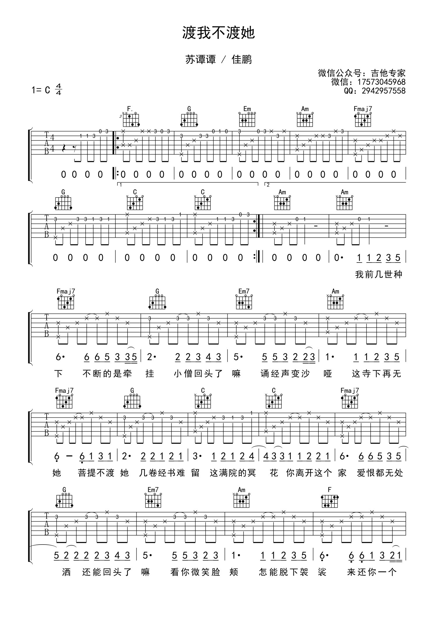 • 渡我不渡她吉他谱 - 苏谭谭/佳鹏 - C调吉他弹唱谱第1张