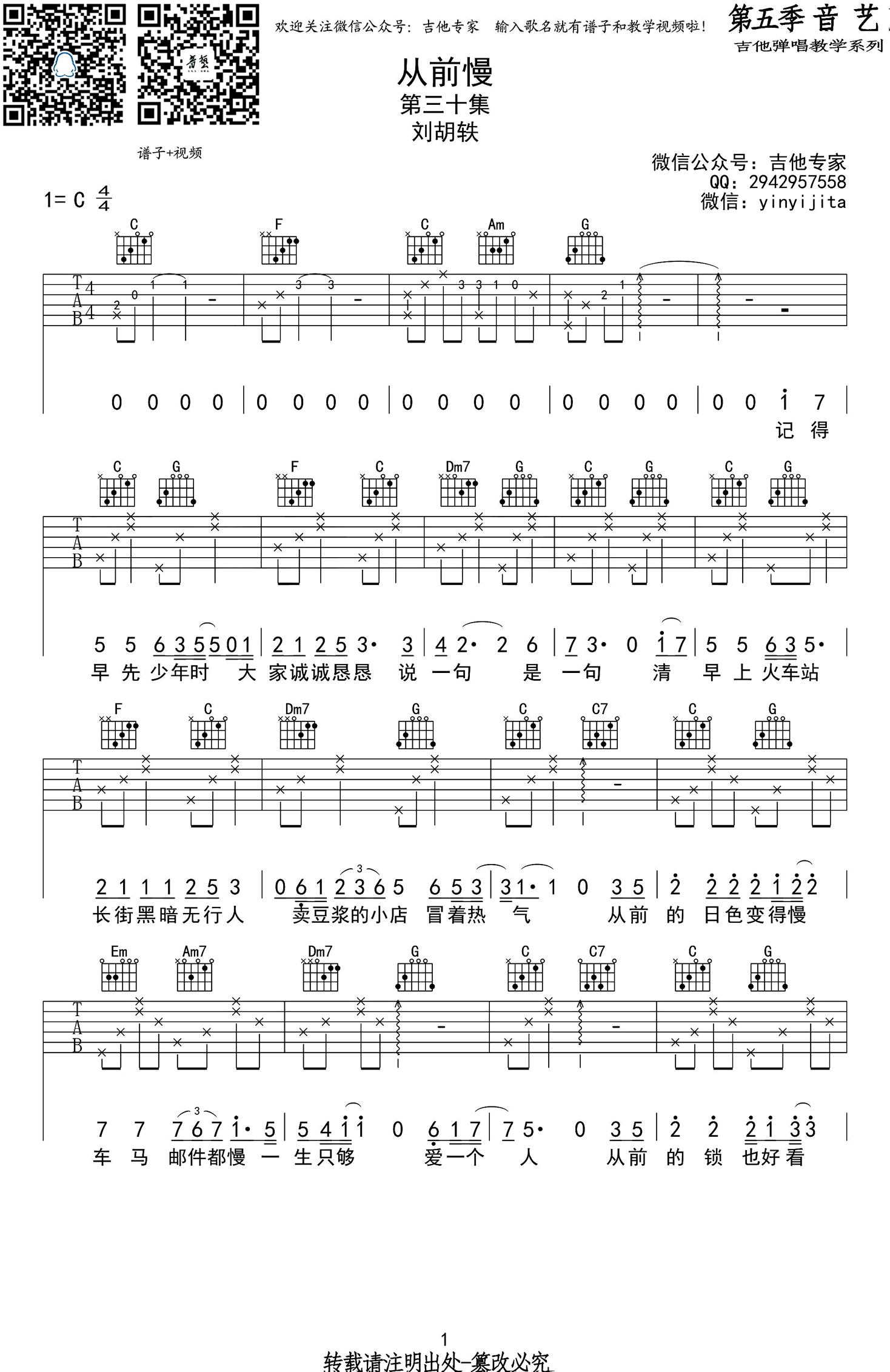 曲谱介绍: 从前慢吉他谱,C调简单版,适合吉他弹唱,从前慢六线谱,高清图片谱,中国好歌曲刘胡轶的原创作品。新一季《中国新歌声》节目开播,19岁学员叶炫清仿佛炎夏的一阵清风,凭借《从前慢》的精彩的演唱,得到四位导师肯定。 本曲谱为音艺吉他编配改编,琴友们在节奏上可随意一些,不必把节奏弹得那么稳,按照自己的习惯和感觉来,关键是注意情感的把握。