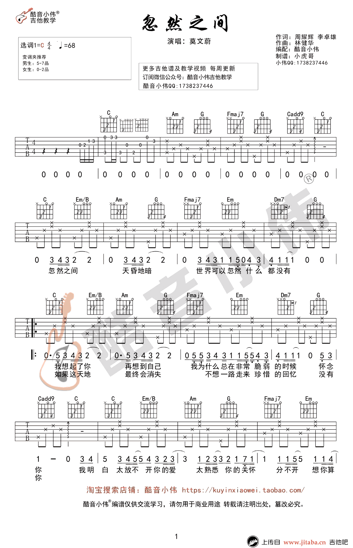 曲谱介绍: 莫文蔚《忽然之间》C调简单版,男生5-7品,女生0-2品,忽然之间吉他六线谱,图片谱高清版。吉他的伴奏琴音,勾起对于往事的深深的回忆,莫文蔚的歌声细腻真挚。唱出在天昏地暗中对情感的珍惜与怀念。总是在忽然之间想起你,想起你笑的样子,想起你弹唱吉他的时候…… 感谢酷音小伟出品,91吉他谱也为大家准备了G调弹唱谱和吉他教学视频,琴友们可以选择练习。