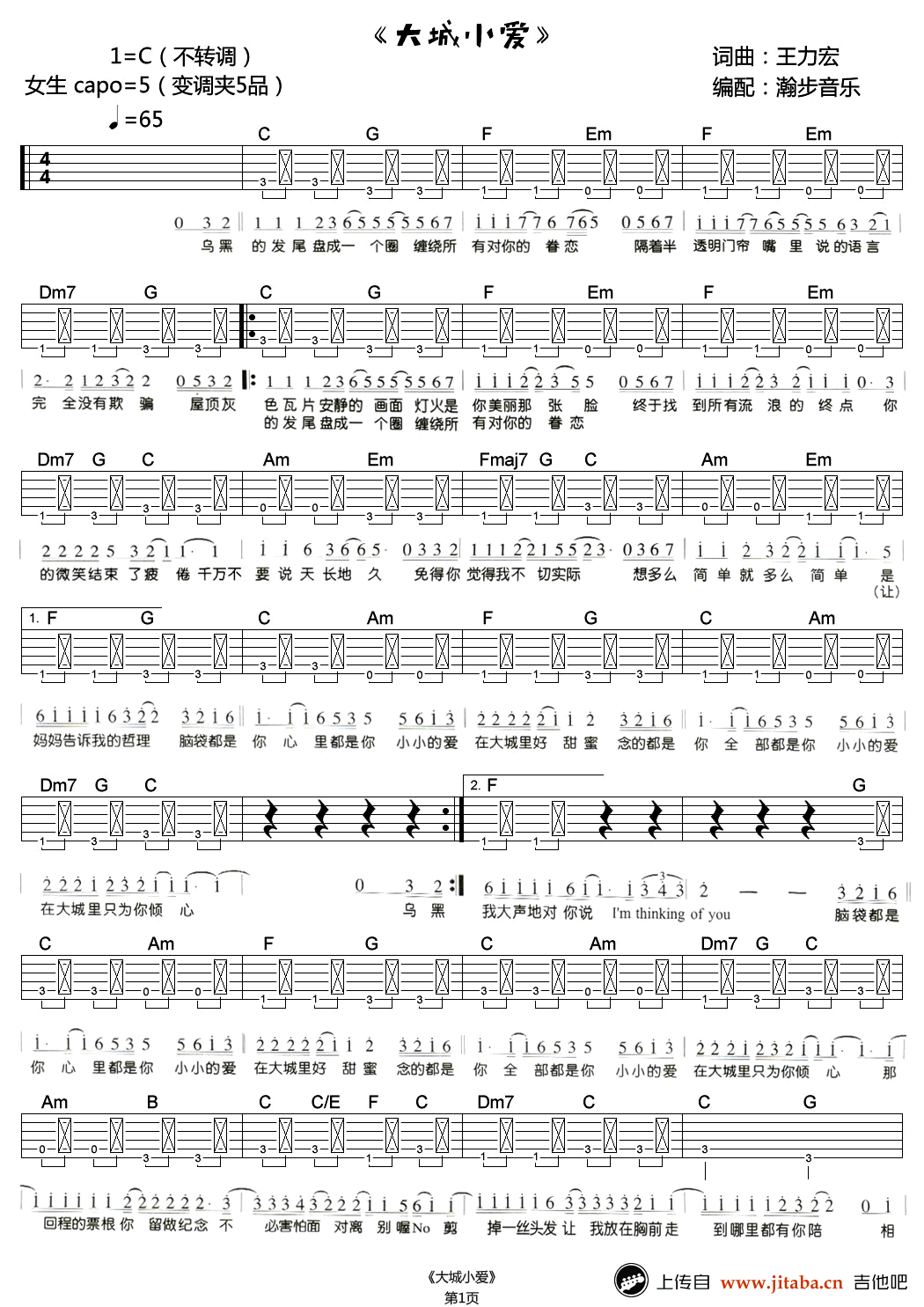 曲谱介绍: 王力宏《大城小爱》吉他谱,C调指法,不用转调版本,女生CAPO夹五品。吉他声中低吟浅唱,唱着小小的爱,唱出对你的眷恋。大城小爱六线谱,图片谱高清版,瀚步音乐编配,91吉他谱网站整理上传。 王力宏的这首经典歌曲不太好唱,特别是一个小节里出现正拍、反拍、反拍、再正拍的情况,但是弹奏起来还是比较容易上手的。建议琴友们勤加练习。本曲谱适合初学者,以熟悉弹奏吉他为目的,更快适应弹吉他的感觉。